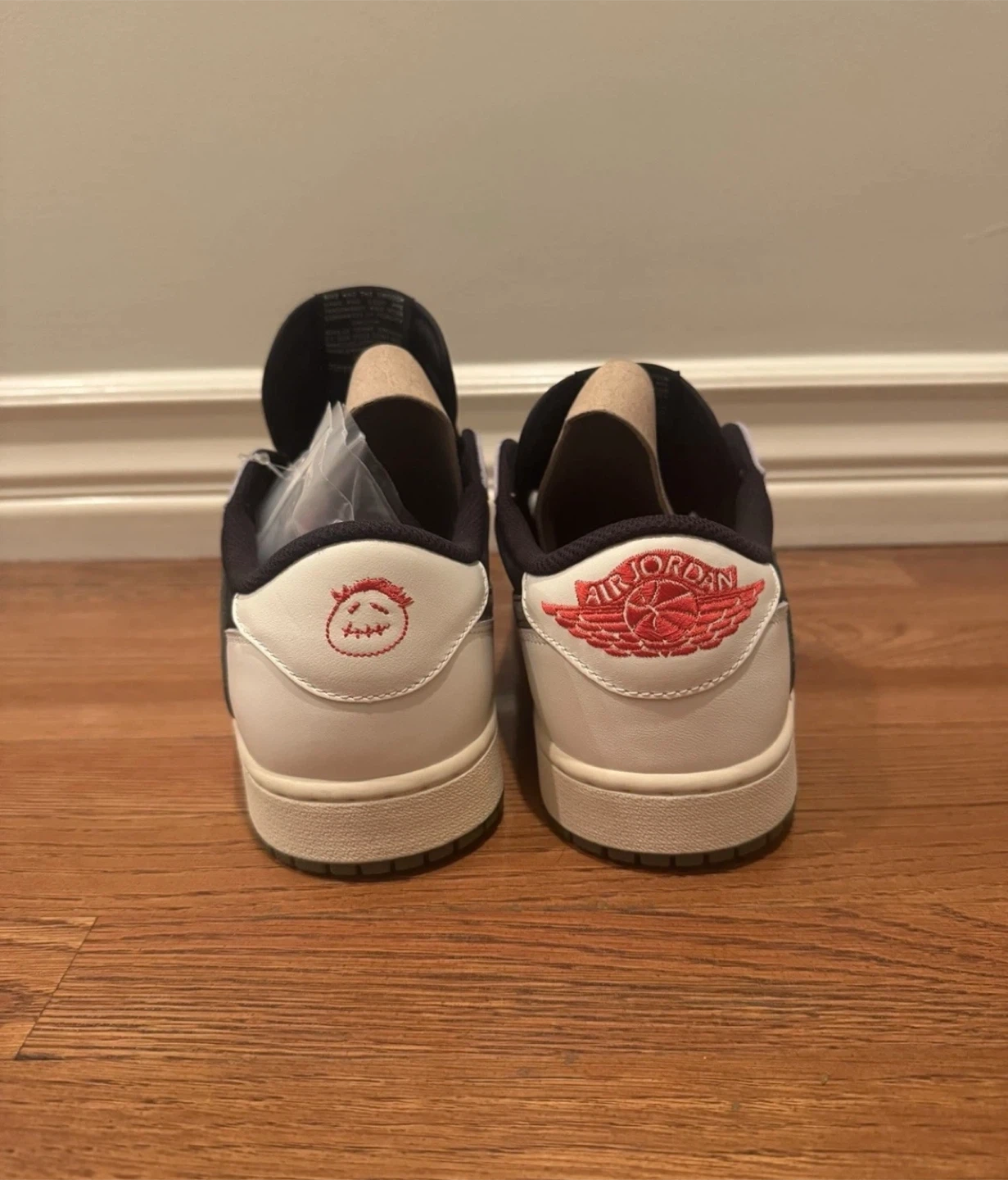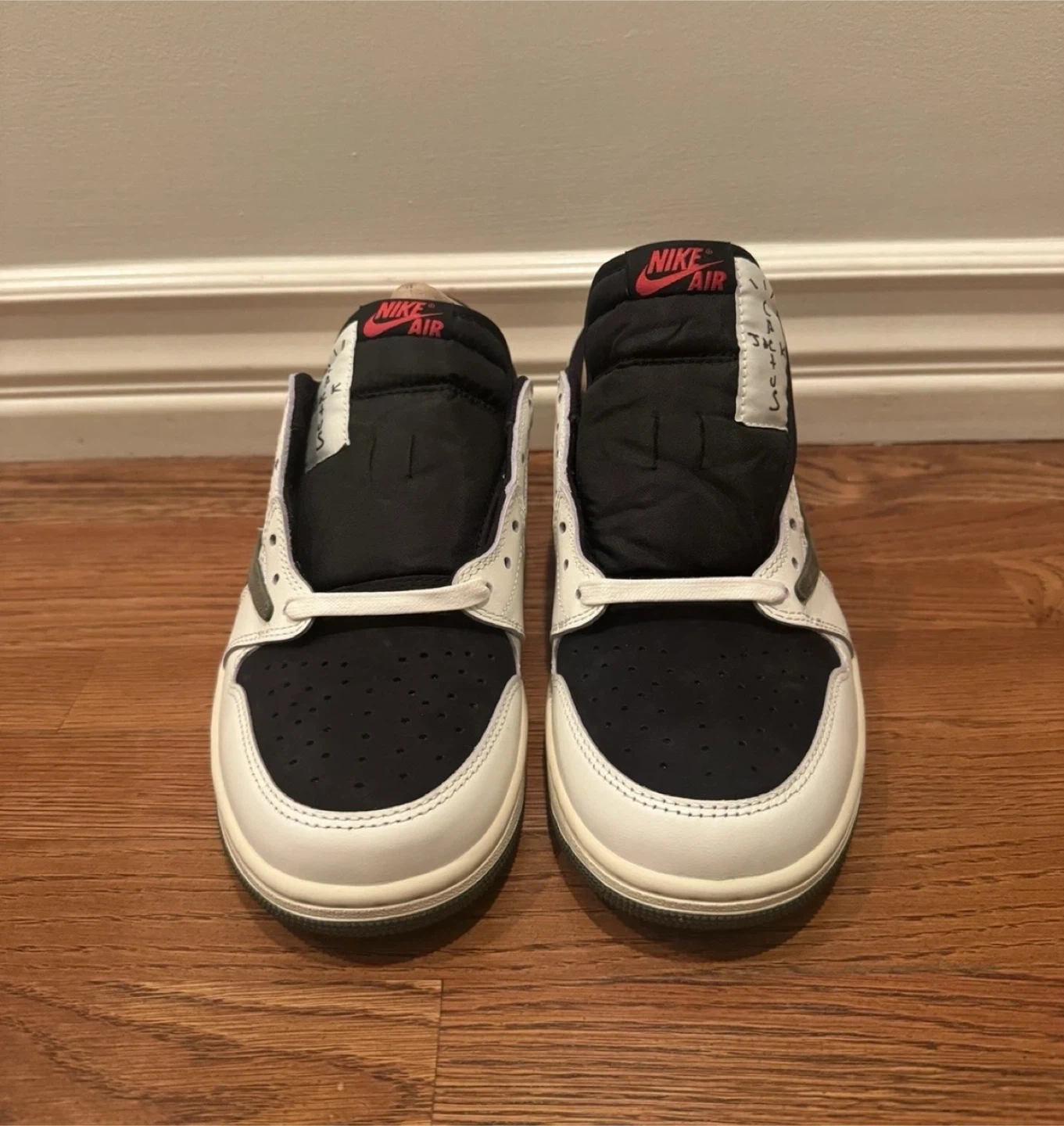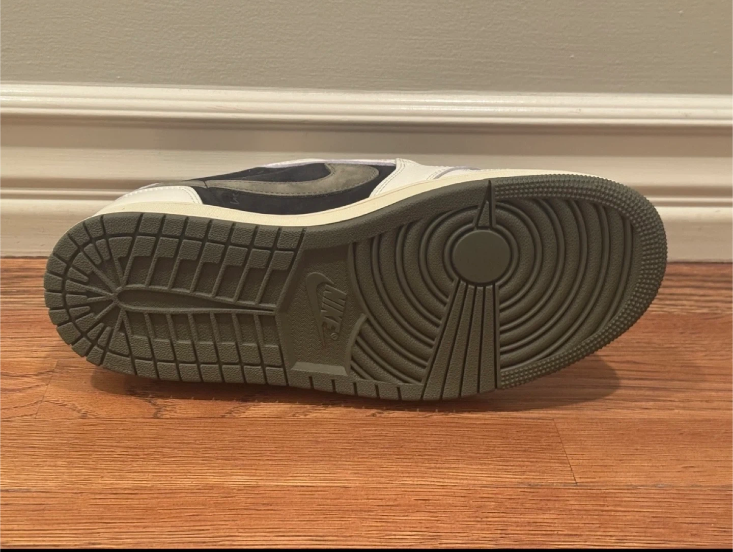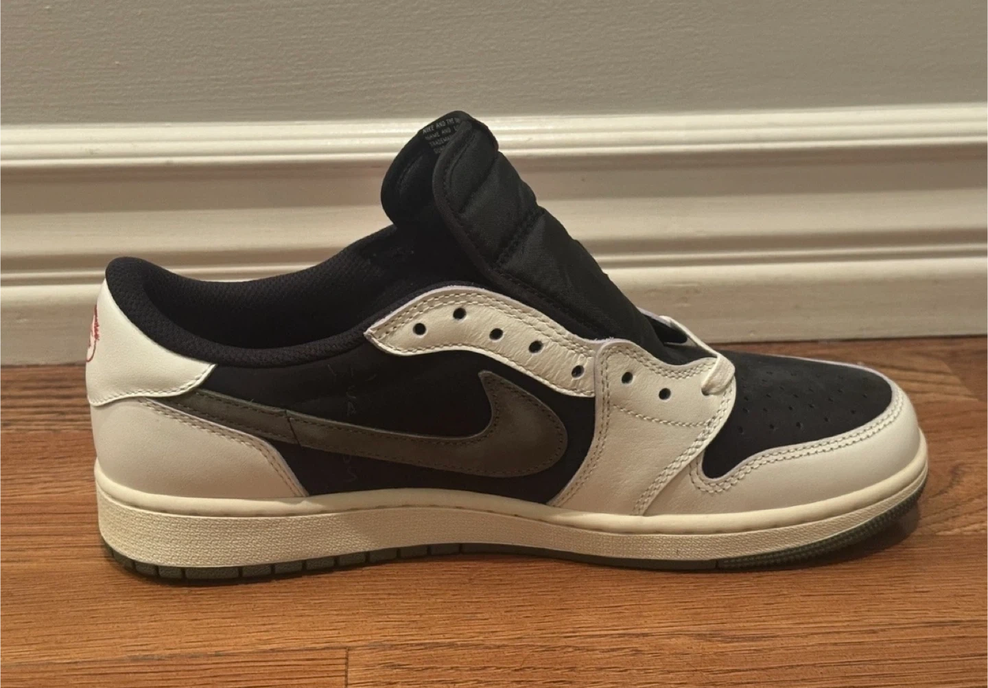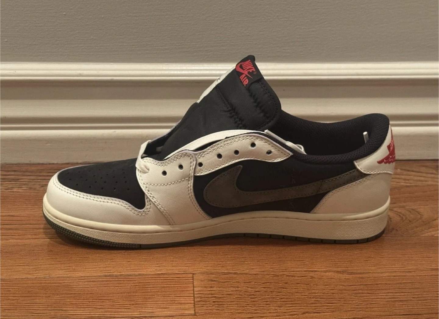 Nike Air Jordan 1 Low sneakers in collaboration with Travis Scott. Features a mix of leather and suede. Includes the original Nike box. These are low-top athletic shoes.