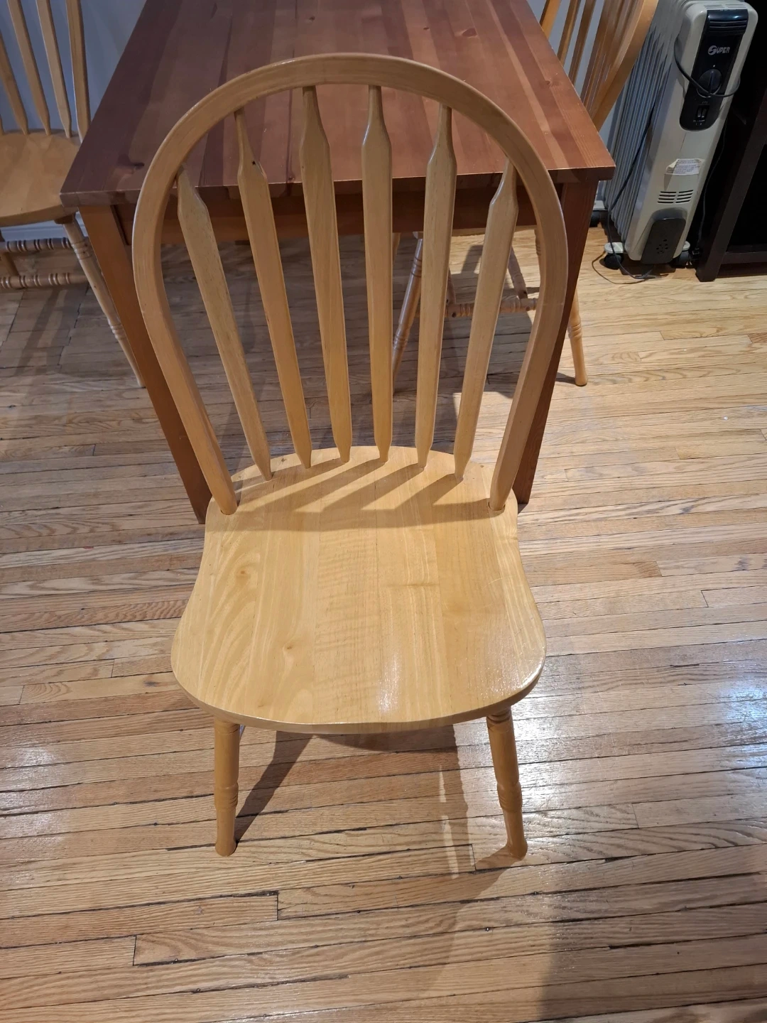 Classic light wood dining chair with a spindle back design. Simple and sturdy construction. Perfect for a kitchen or dining room.