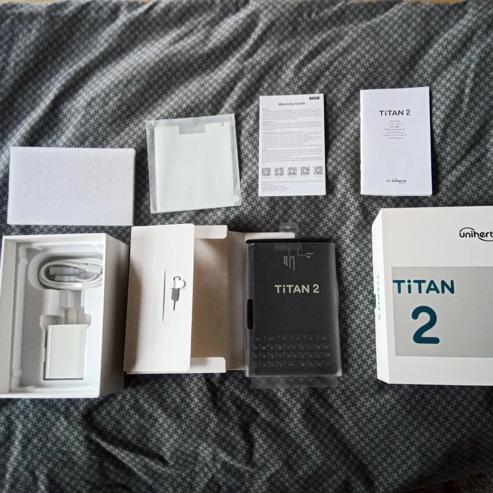 Open Box Unihertz Titan 2 5G smartphone with a physical QWERTY keyboard. Runs on Android 15 and features 12GB of RAM with 512GB of storage. Let me know if you're interested!