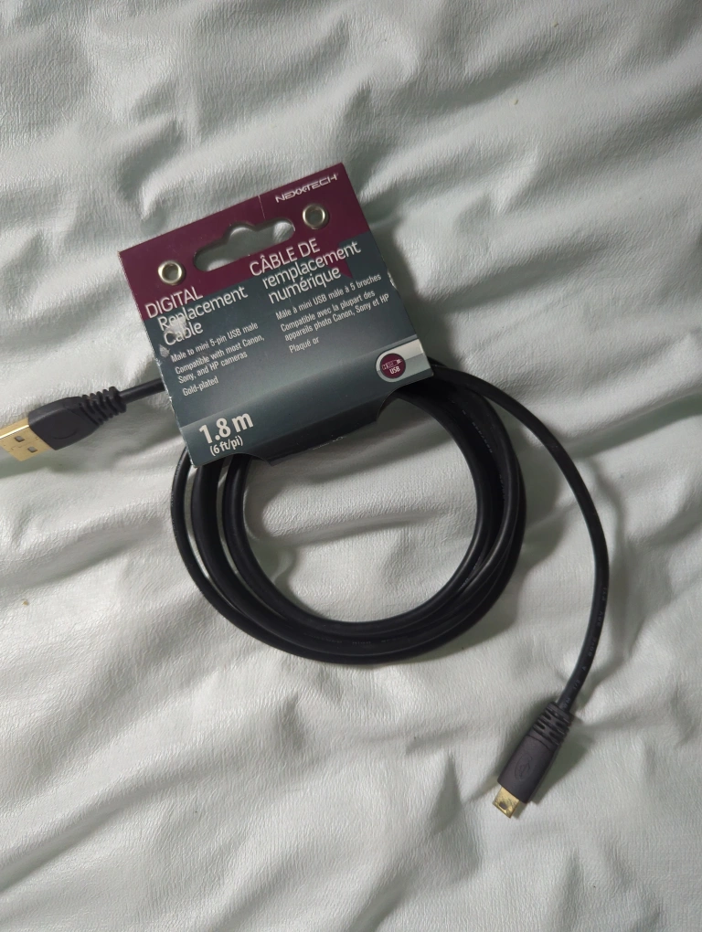 Selling a Nexxtech digital replacement cable, 1.8m (6ft). It's a male to mini 5-pin USB cable, compatible with most Canon, Sony, and HP cameras. Gold-plated.