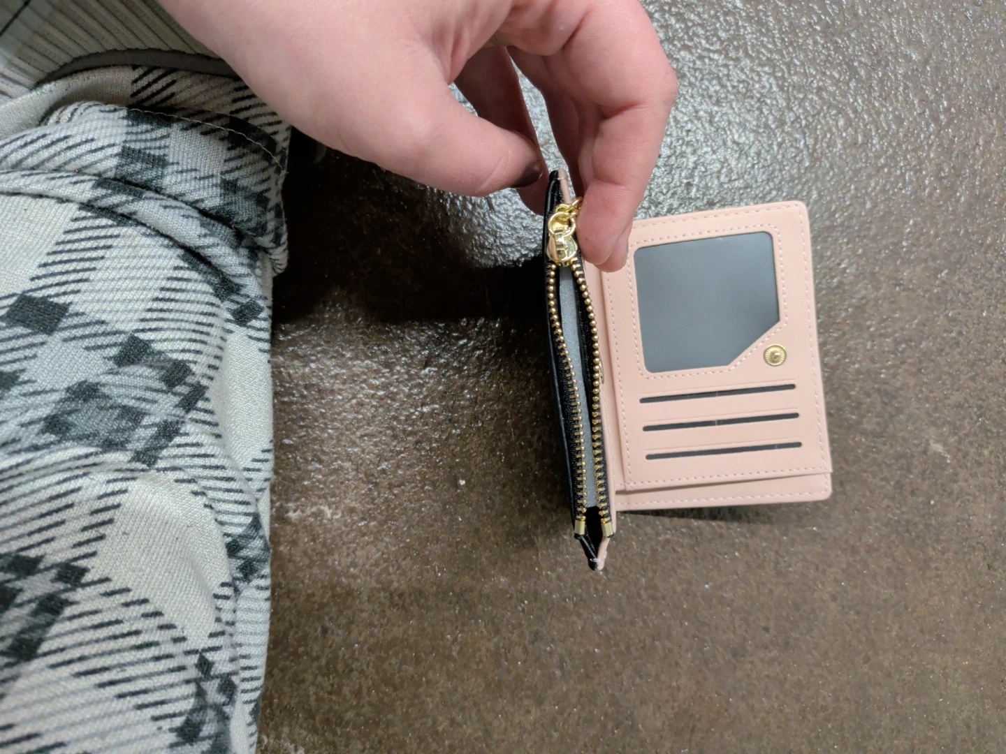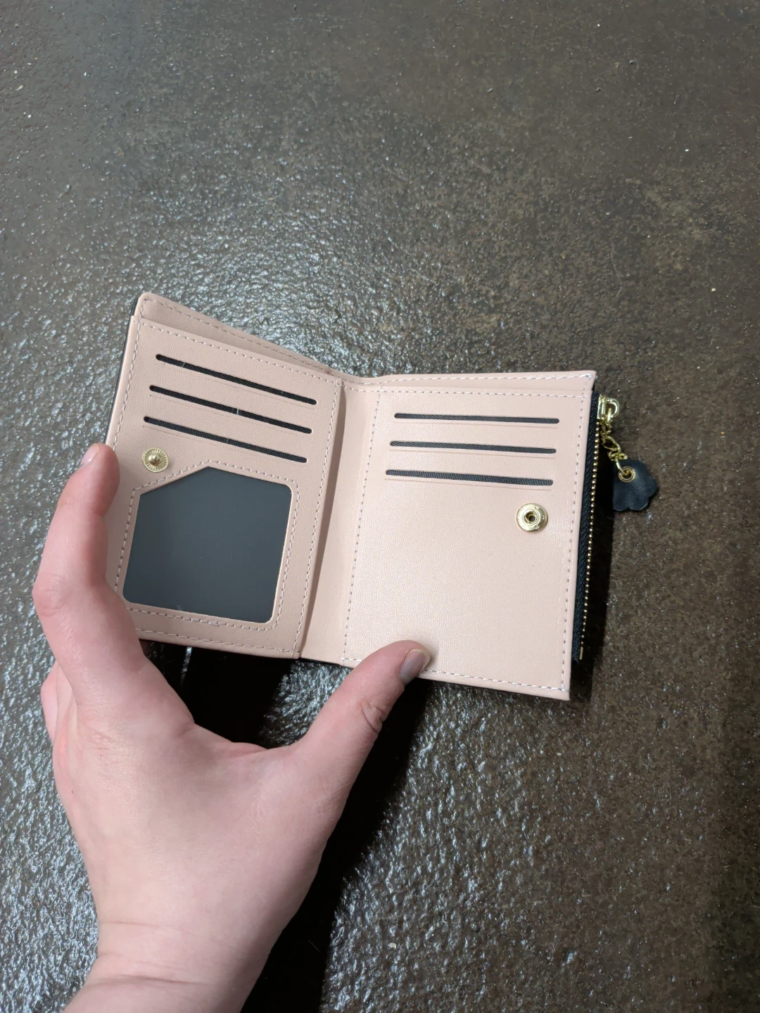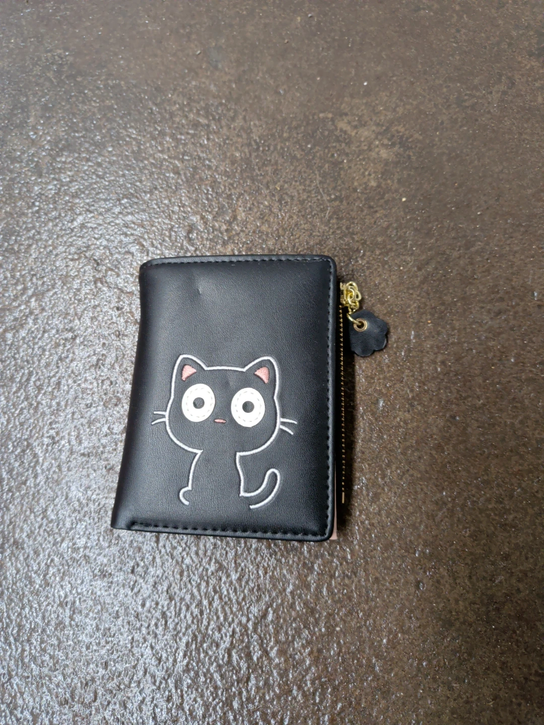 Cute black wallet with a black cat graphic. Multiple card slots and a zippered coin pocket. Faux leather material.