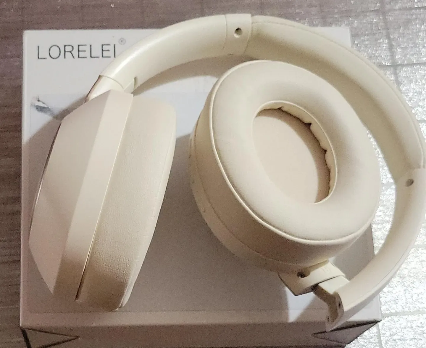 LORELEI over-ear headphones in a soft beige colour. They fold for easy storage. Perfect for listening to music or podcasts.