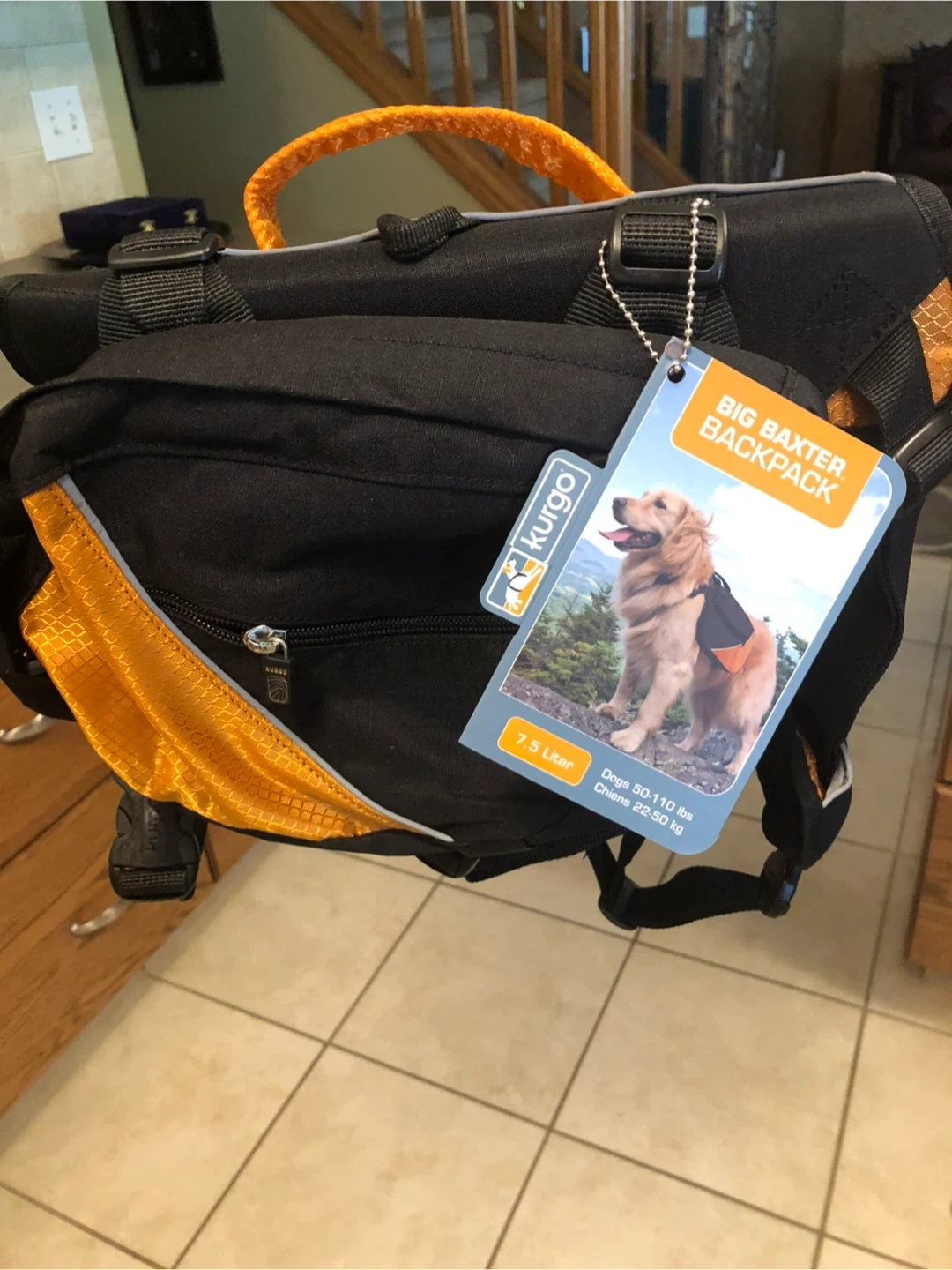 Kurgo Big Baxter dog backpack with 7.5 Liter capacity. Designed for dogs 50-110 lbs. It's black with orange accents. Great for carrying essentials on hikes!