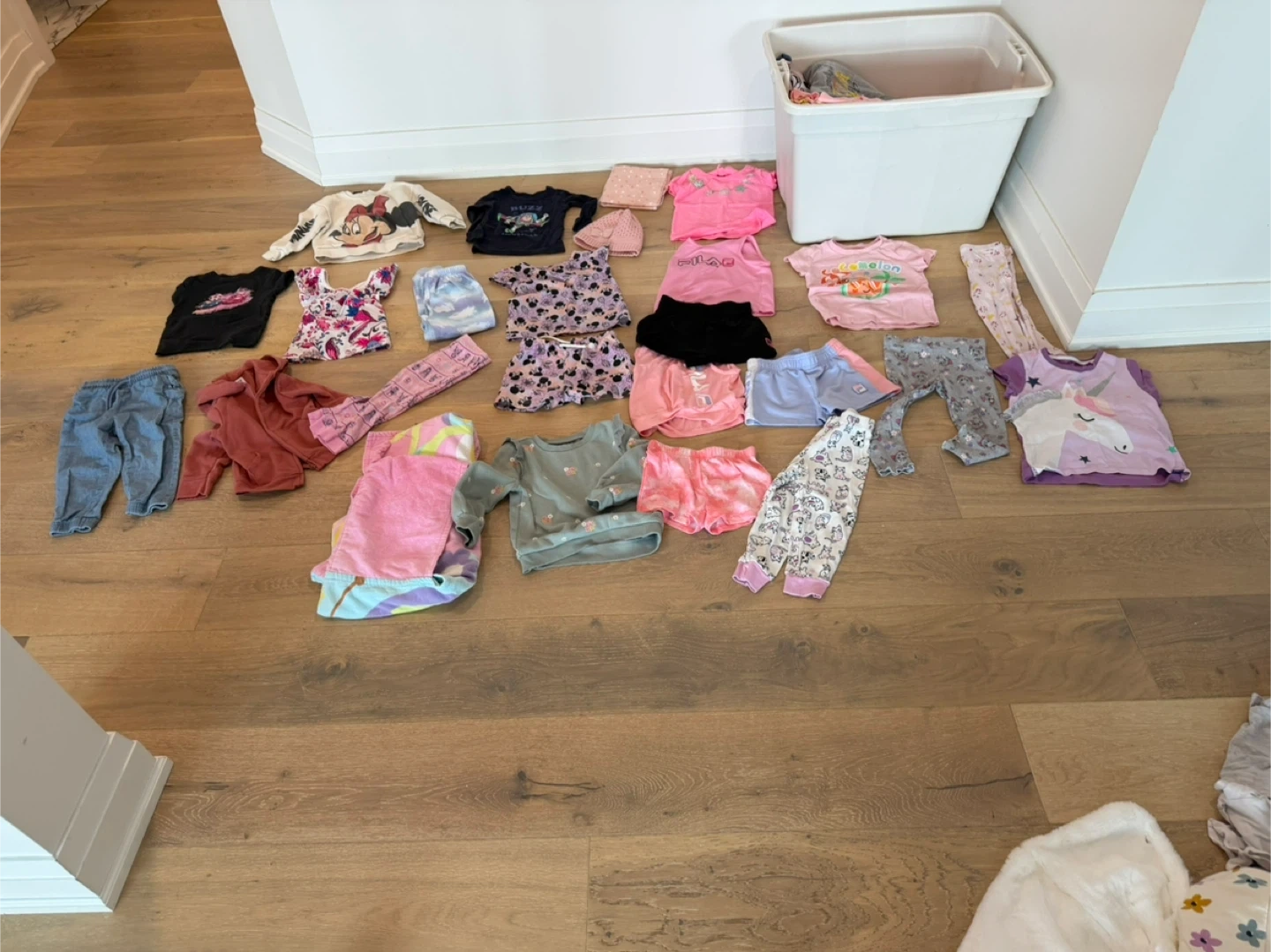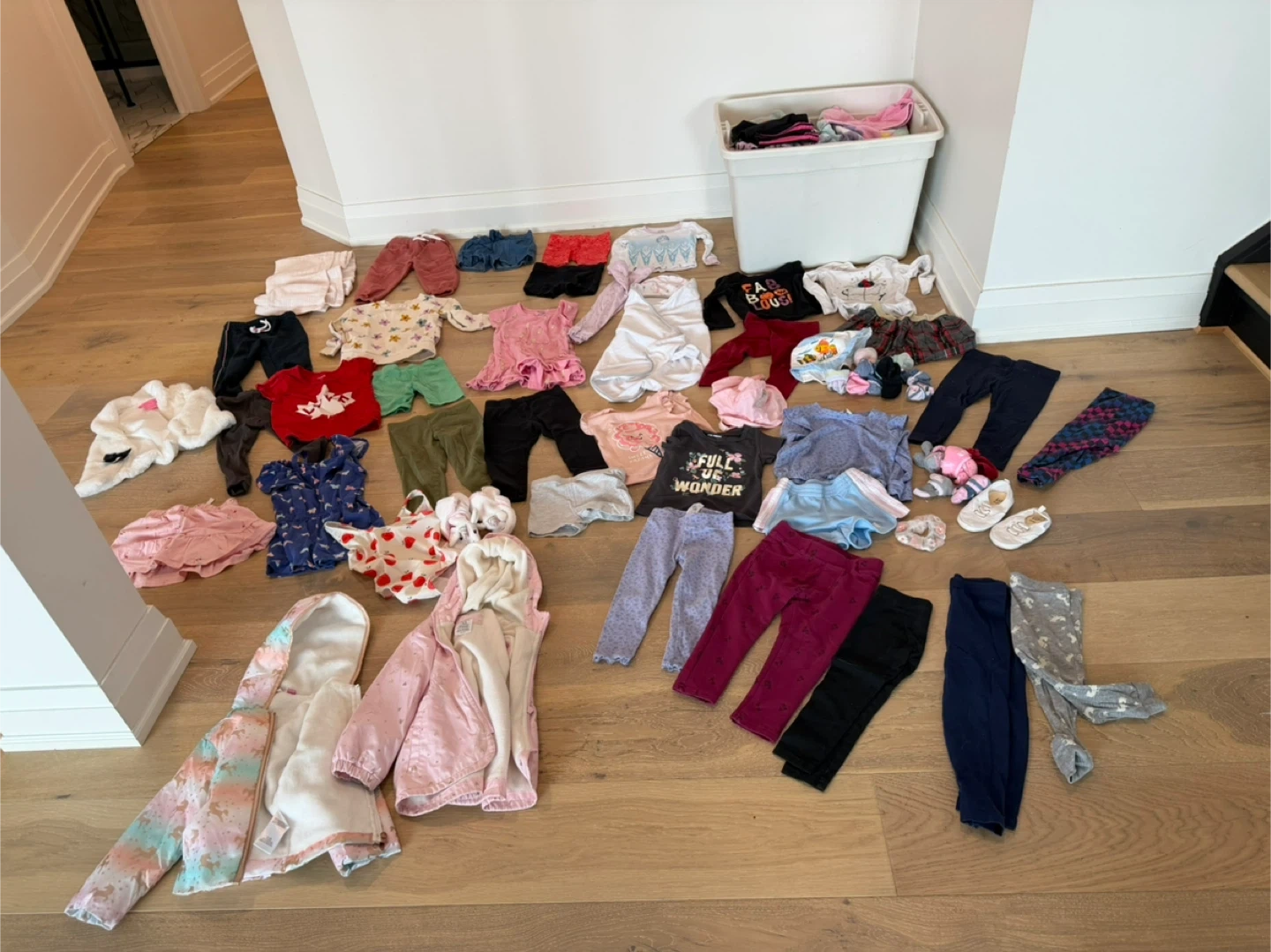 Bundle of assorted toddler girls' clothing. Includes tops, leggings, and more. Assorted sizes and designs. A few items 18-24 months ,Size 2 and 3. Pj’s, shorts, shirts, leggings that go above the ankle, jean over alls, swaddle blanekts and a fur blanket.