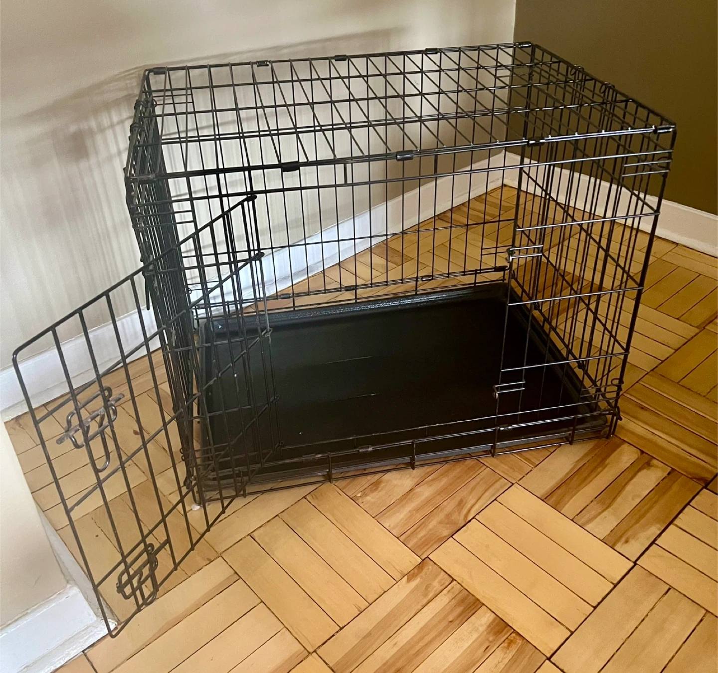I'm selling a large dog crate, ideal for medium to large breeds. It offers a secure and comfortable space for your furry friend. The crate features a durable metal constructiont, a removable plastic tray for easy cleaning, and a front and side door with a secure latch. Perfect for training, travel, or providing a den-like space at home. the crate is fully functional and sturdy.