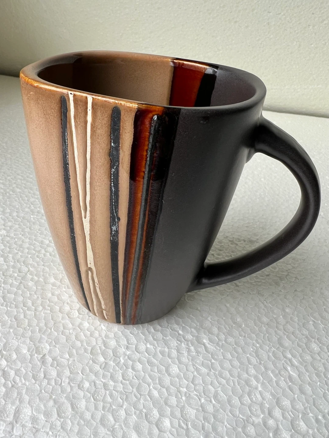 The mug features a unique design with brown, black, and white colours.