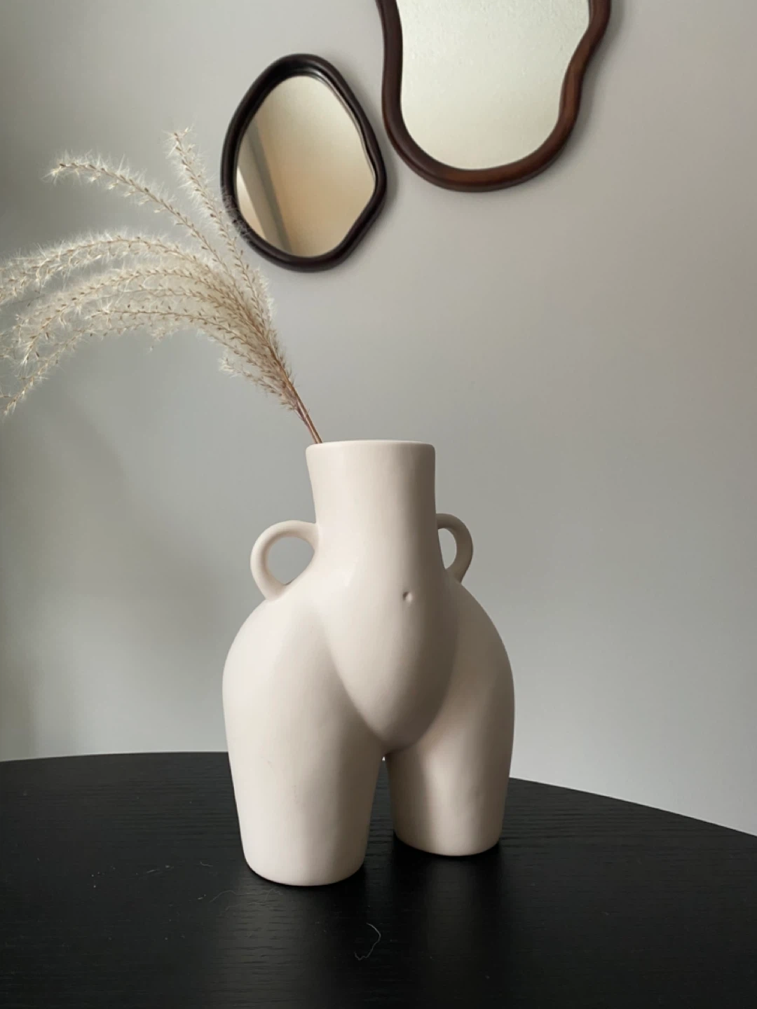 A unique ceramic vase shaped like a human posterior. It's ceramic and finished in a matte cream colour. This piece adds a quirky touch to any room's decor. I styled it in a bathroom!