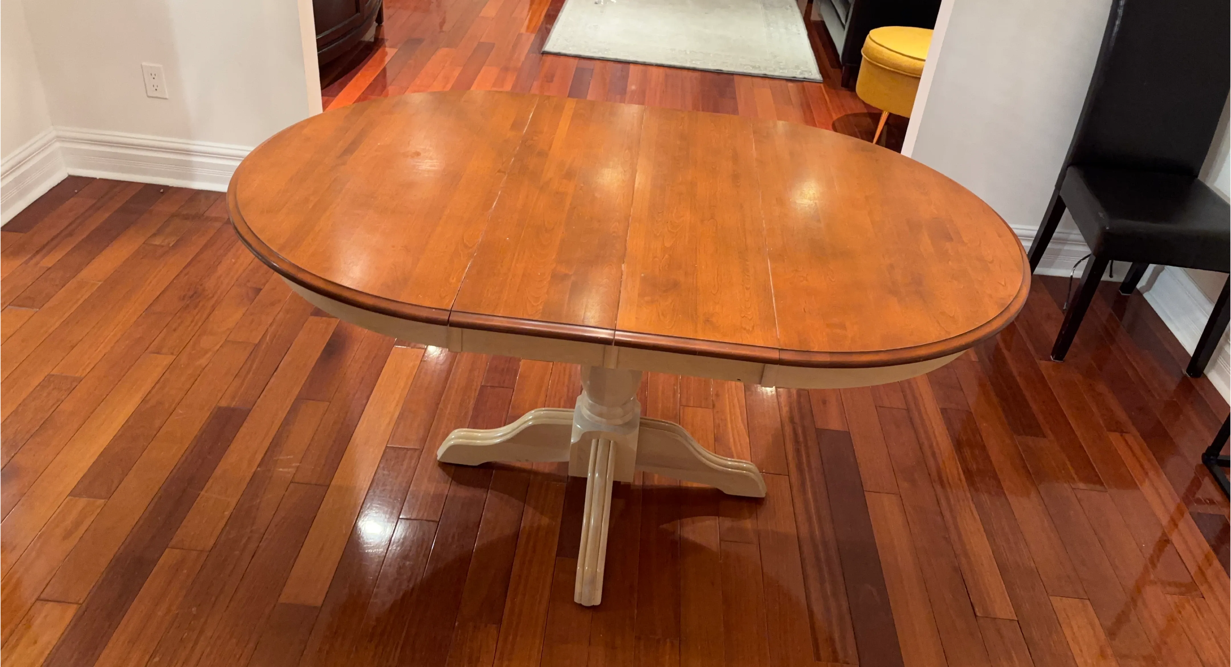 This oval-shaped dining table features a natural wood finish on the tabletop and a cream-coloured pedestal base. It's suitable for everyday meals or entertaining guests. The table's design fits well in various dining room styles.