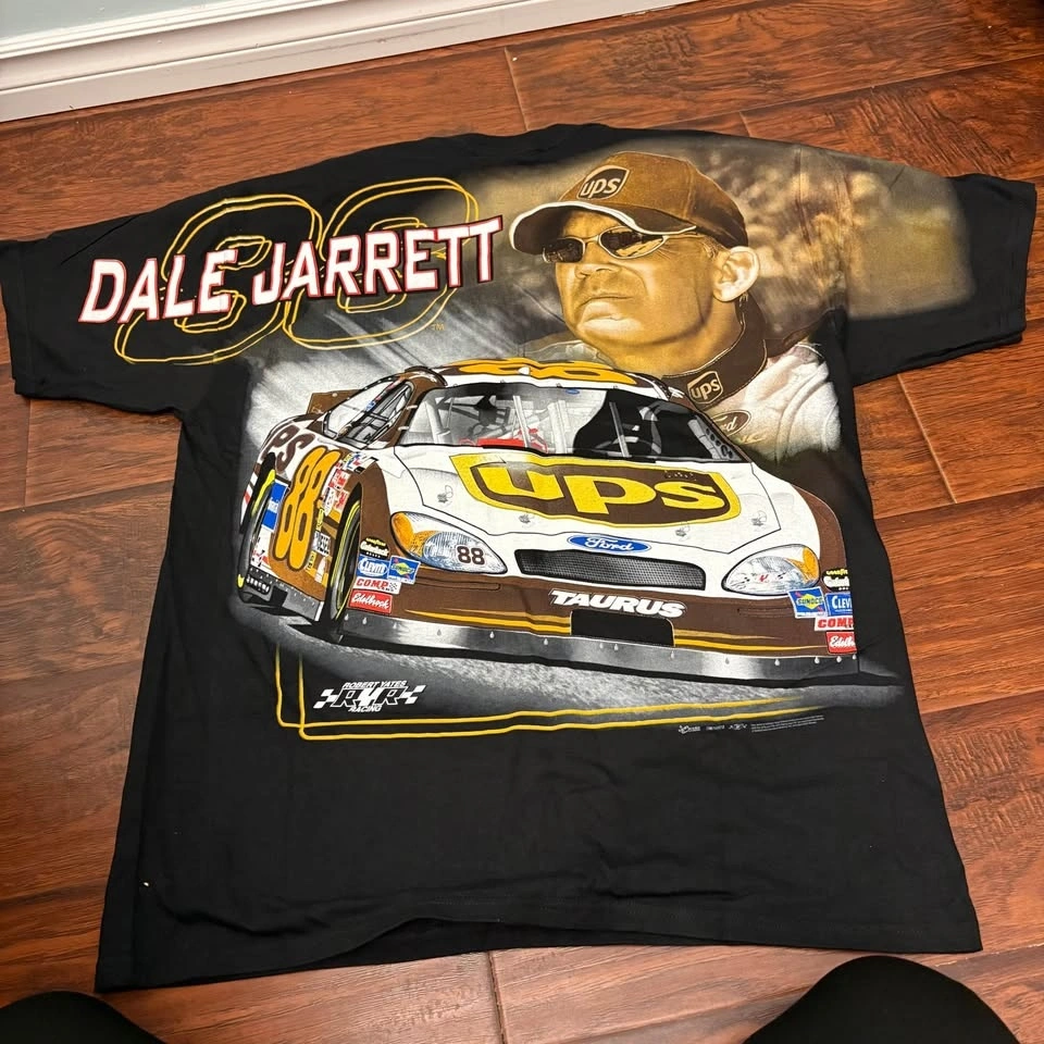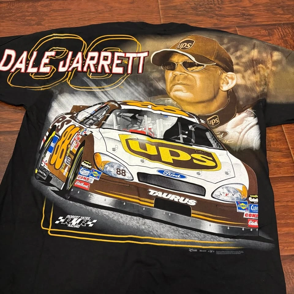 This is a vintage NASCAR Chase Authentics All-Over Print T-shirt featuring Dale Jarrett and his #88 UPS Ford Taurus, likely produced in the late 1990s or early 2000s. Feel free to message if you have any questions!