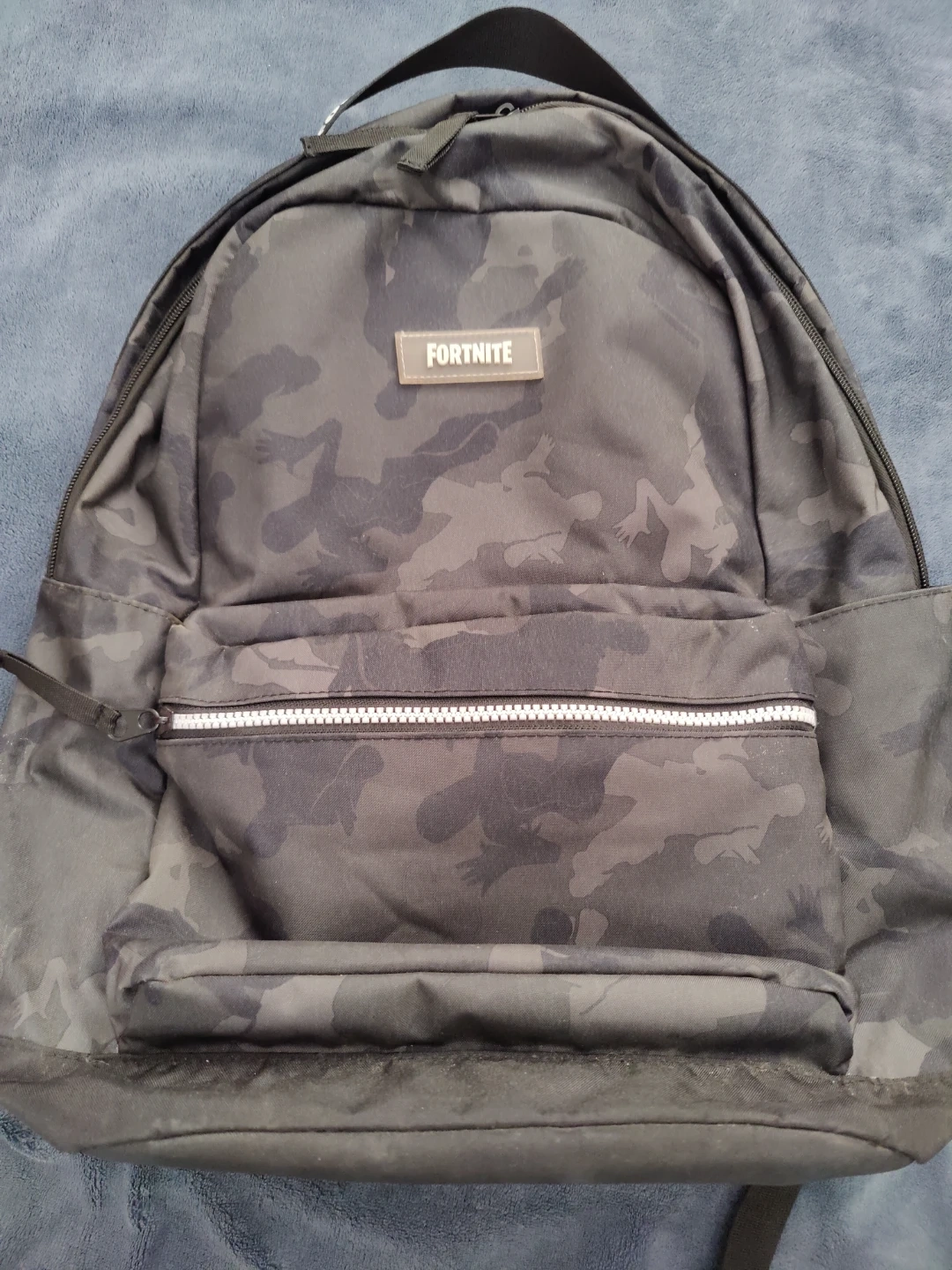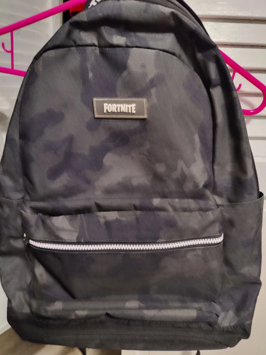 Selling a Fortnite backpack with a cool camo pattern! It has a front pocket with a white zipper and the Fortnite logo on the front. The back straps also have the Fortnite logo. Good for school or everyday use