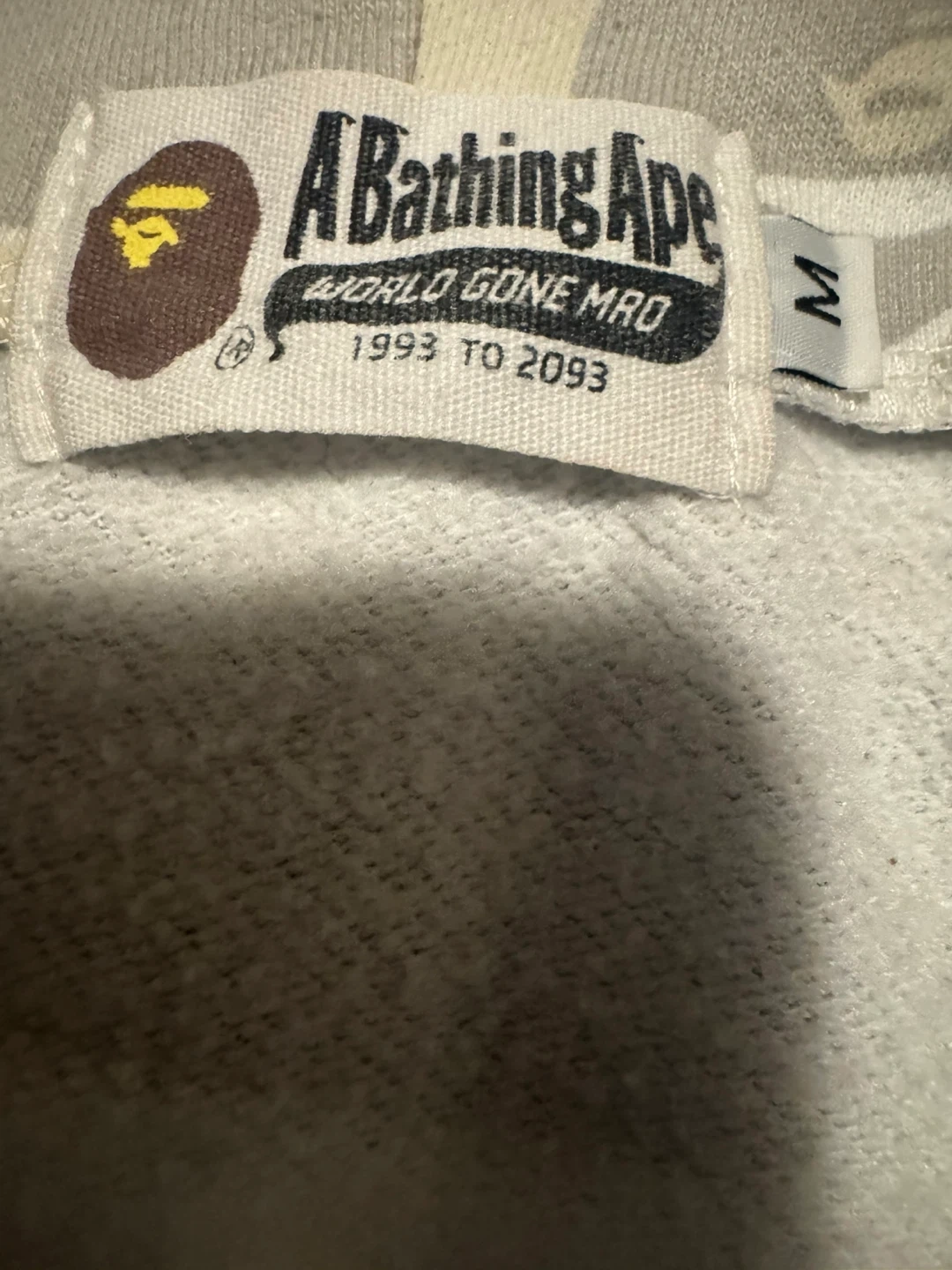 A Bathing Ape full zip hoodie in a light camouflage pattern. Zipup is broken.