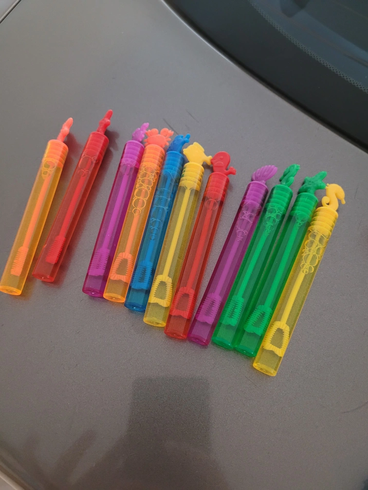 I'm selling 11 colourful bubble wands! They come in a variety of colours, perfect for some outdoor fun. Great for kids' parties or just playing around in the backyard