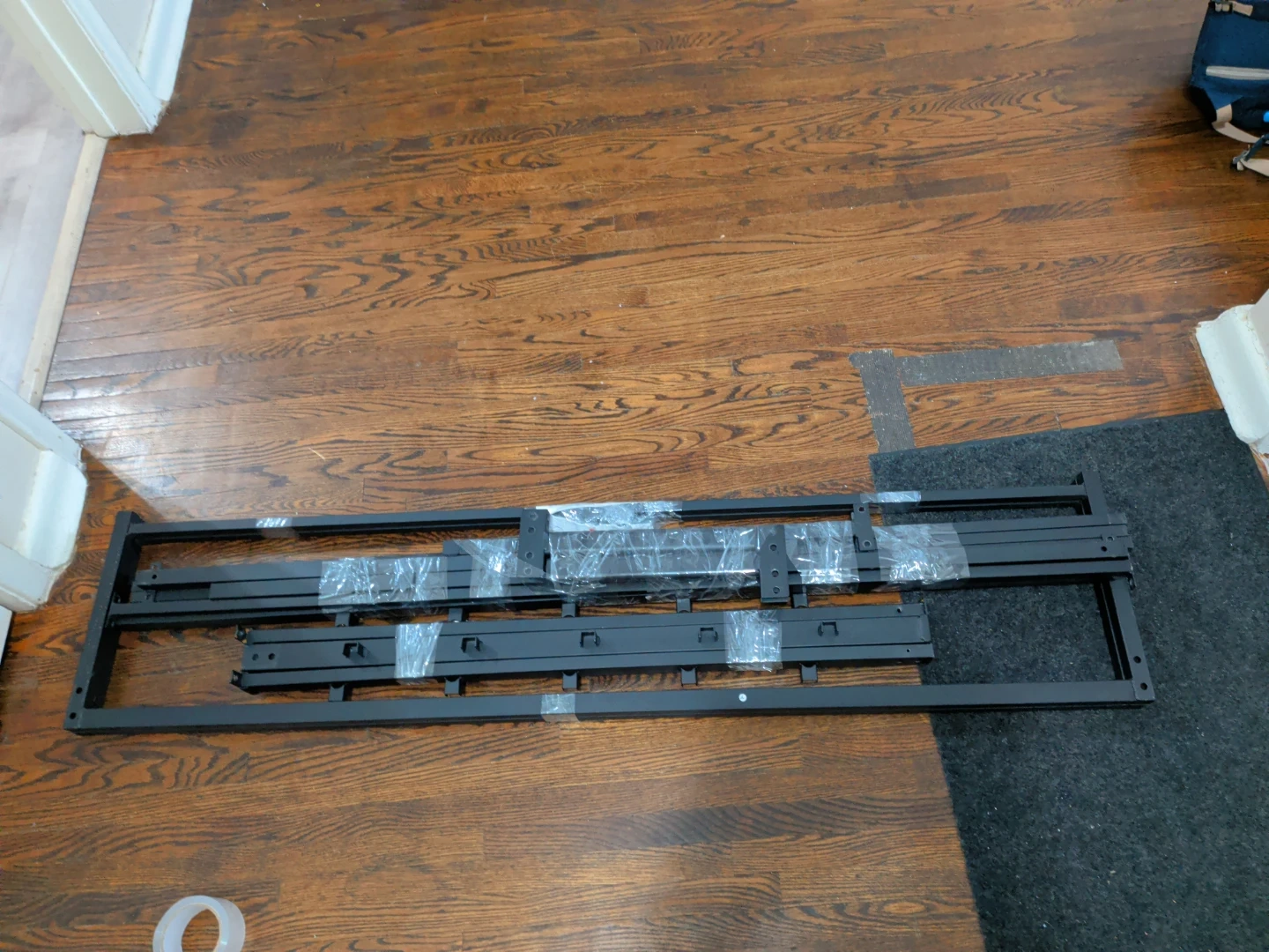 This is a set of black metal bed frame parts. They're all bundled up and ready for assembly. Includes all the metal pieces needed for a bed frame.