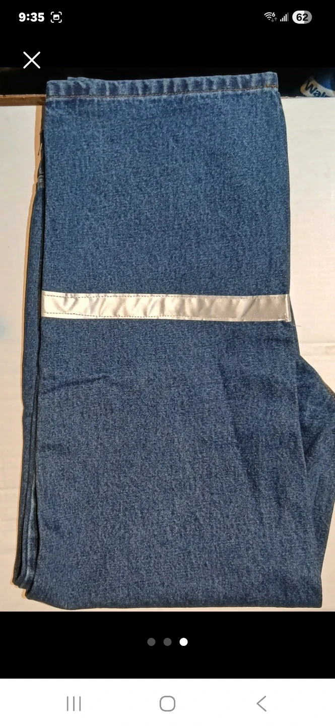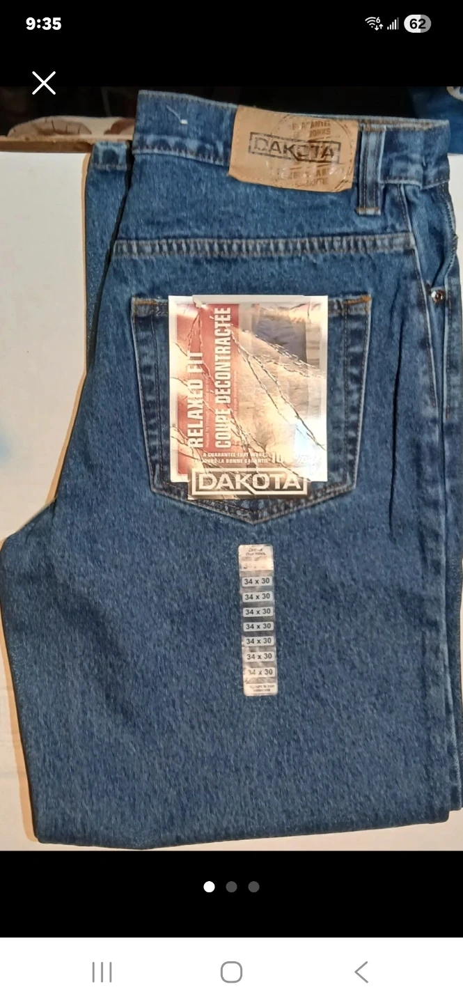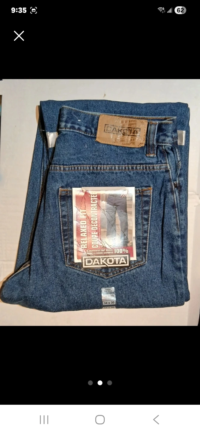 Dakota brand men's jeans in a relaxed fit. These are a size 34 waist and 30 inseam. The denim is blue with a silver stripe detail on the side.