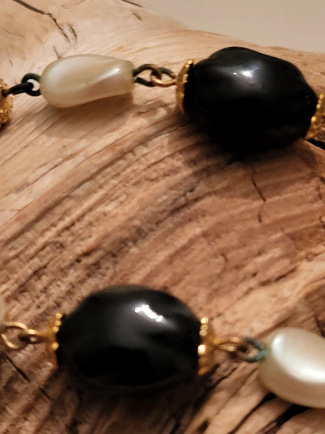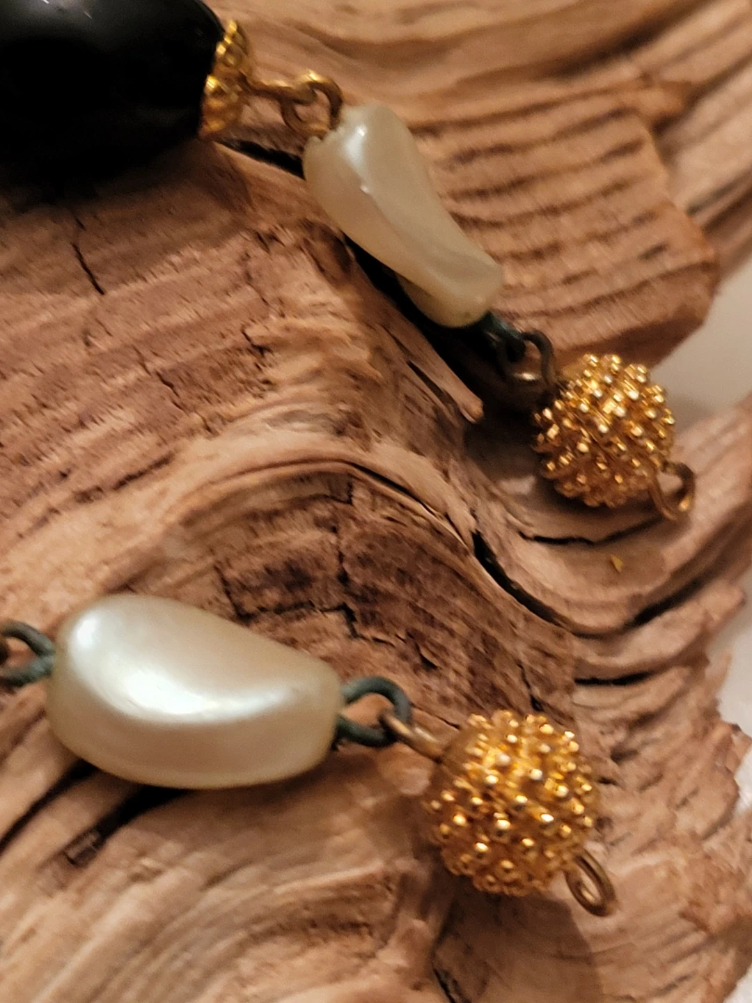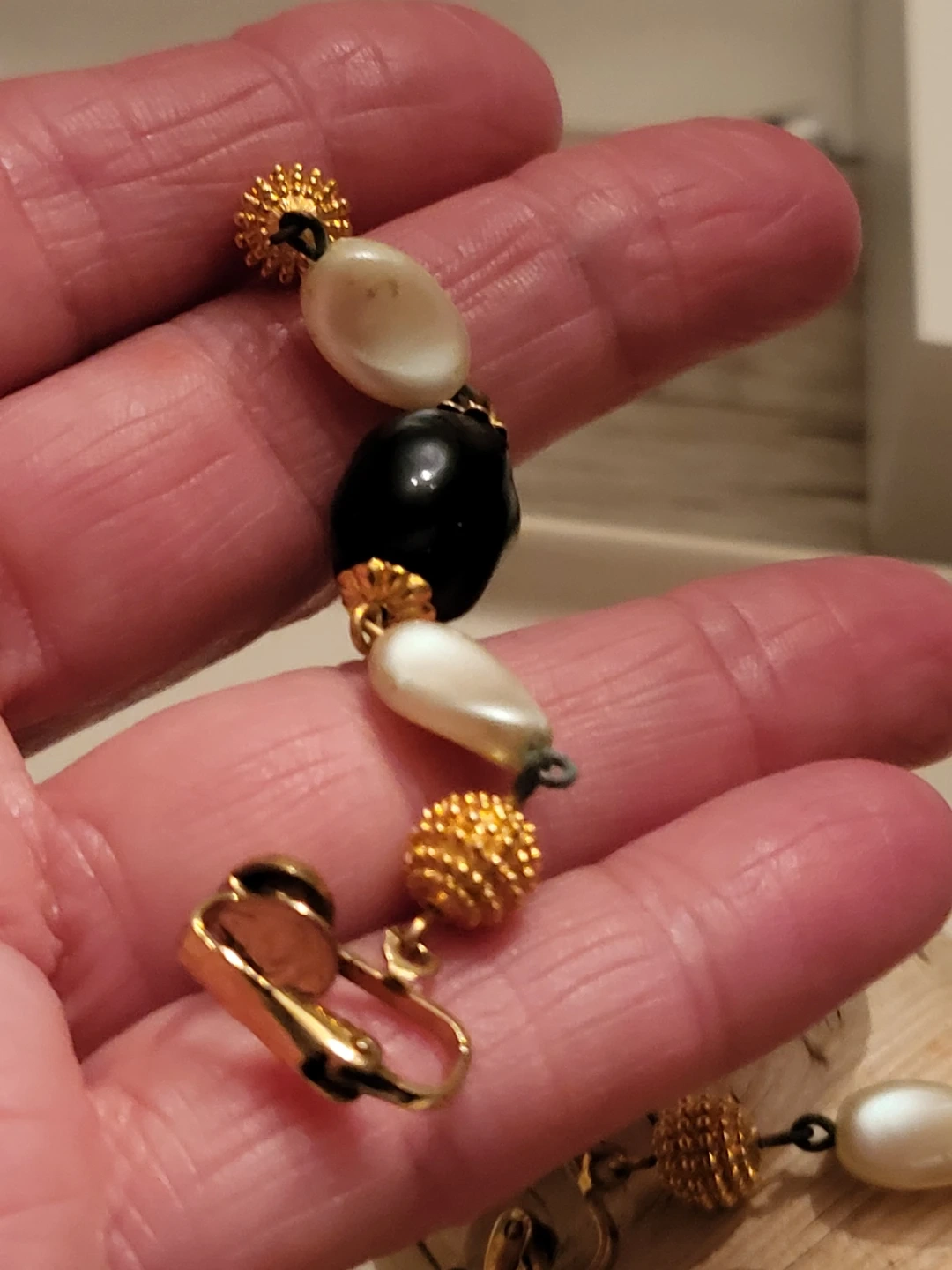 This vintage set of clip on earrings features a mix of shiny black beads and pearlescent white beads, accented with textured gold-tone spheres. The jewellery has a classic, elegant design.