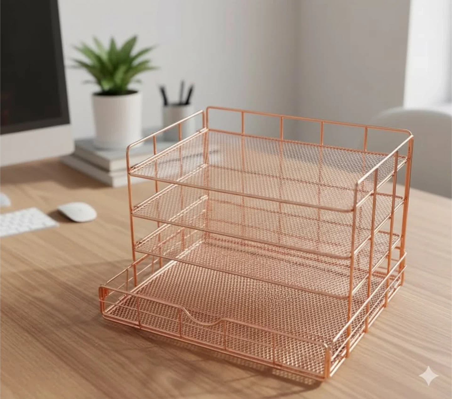 Looking to declutter your desk? This rose gold metal mesh desk organizer is perfect for keeping your papers and supplies tidy. It features multiple tiers and a drawer for extra storage. It's in great condition and ready for a new home!