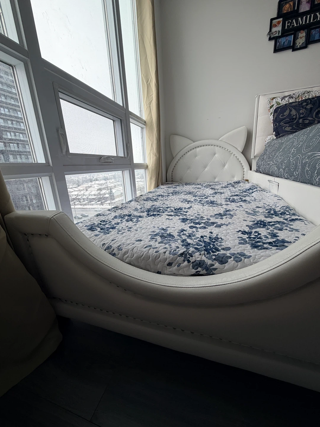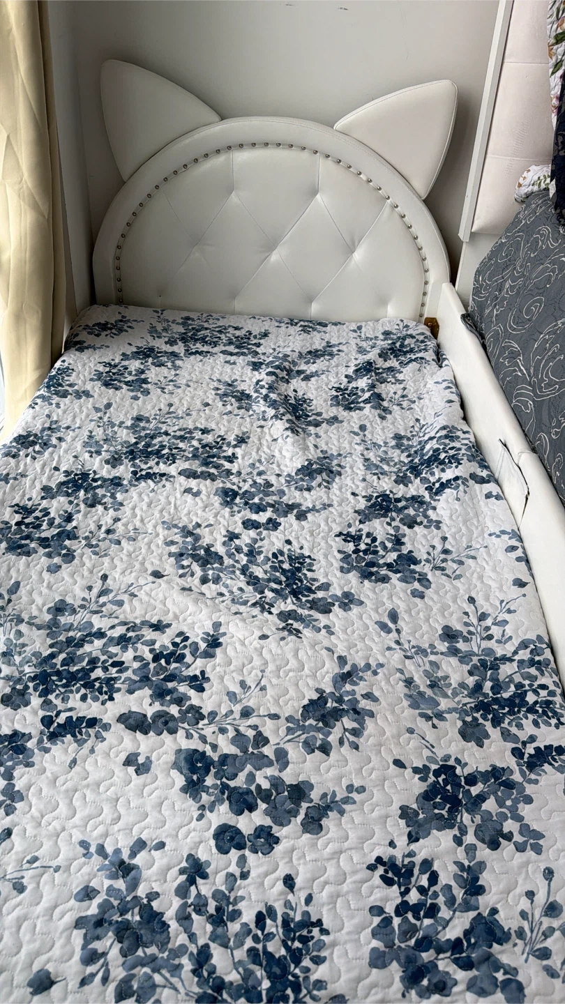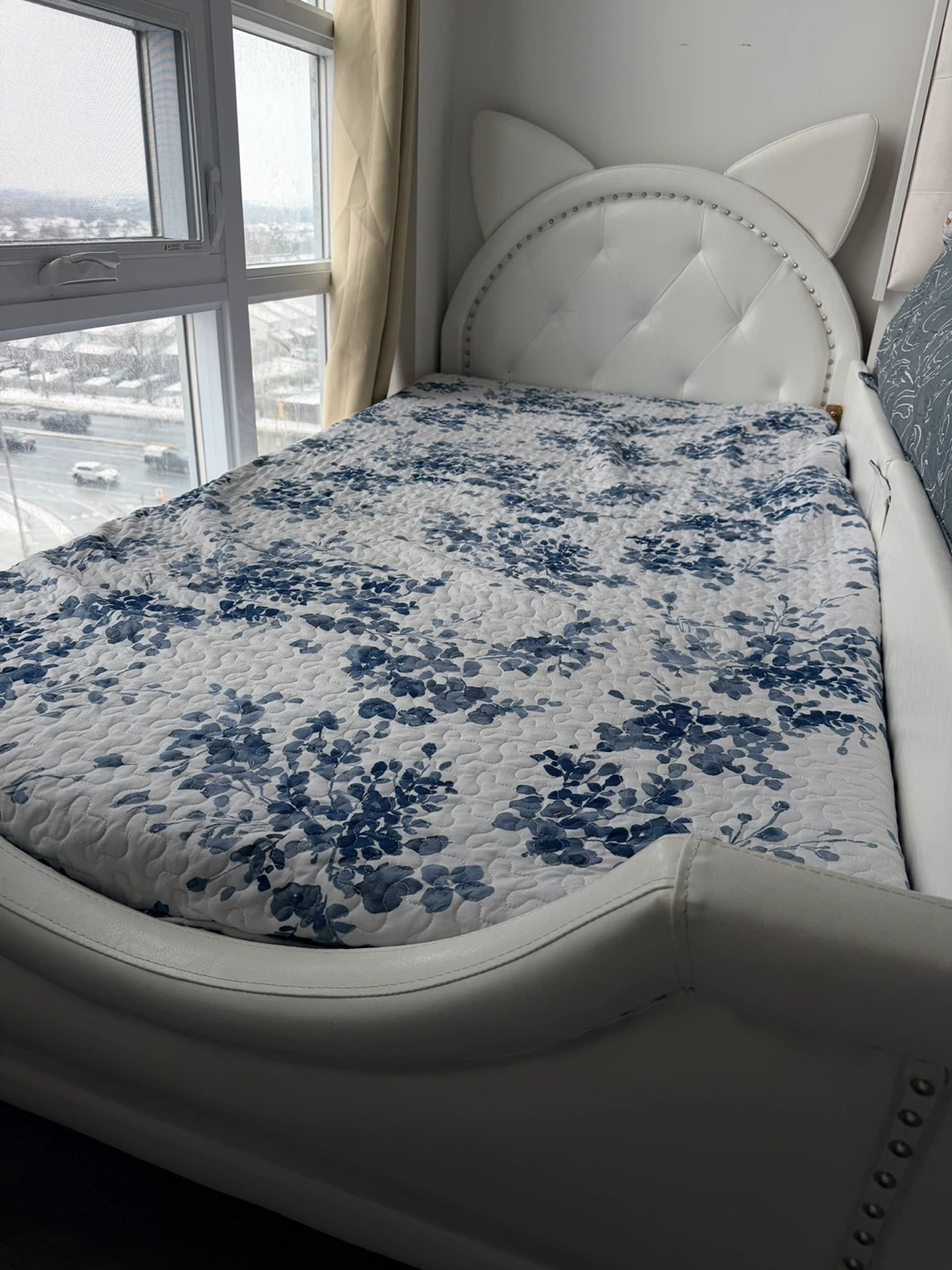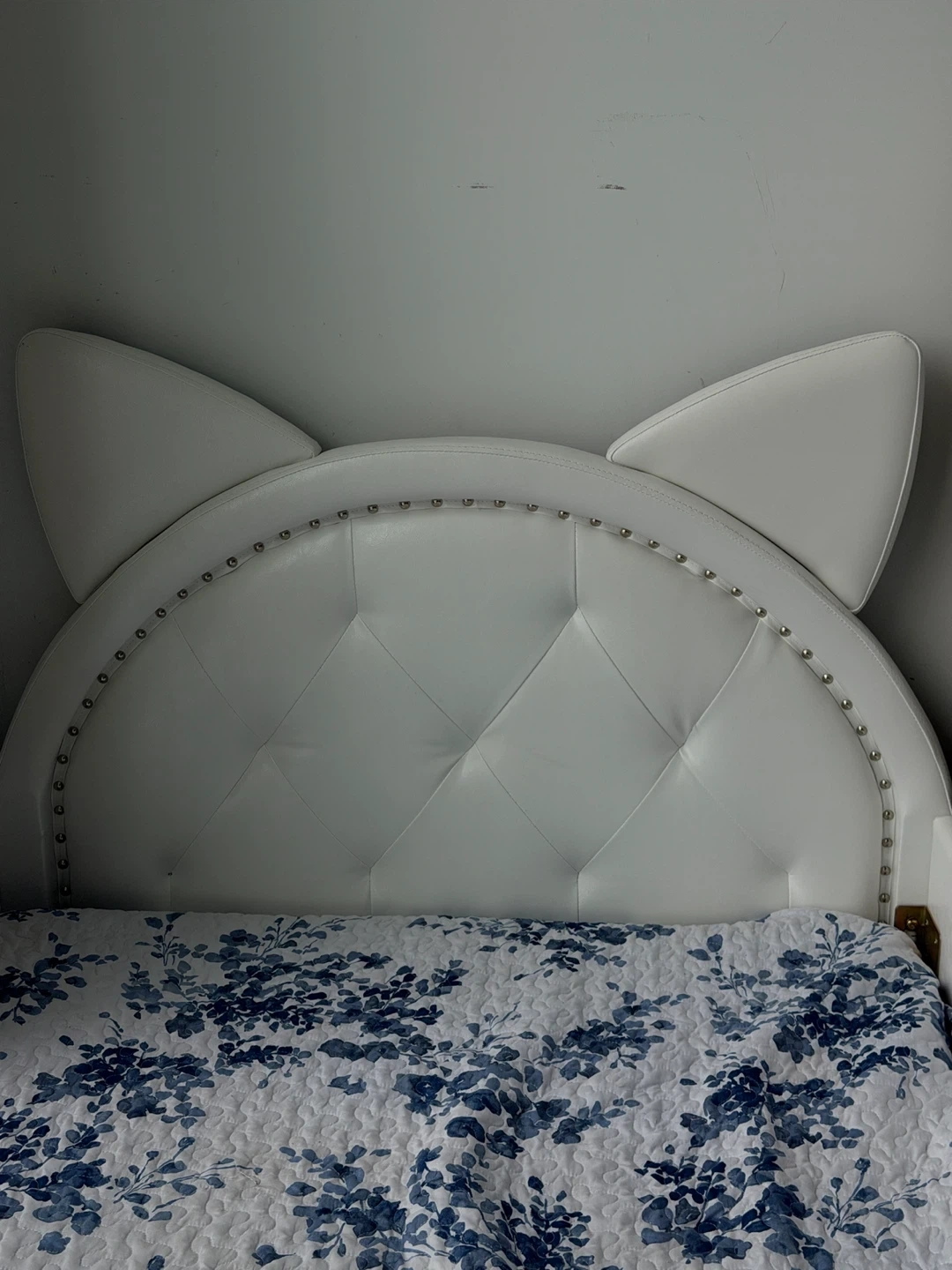 Selling a cute white bed frame with cat ears! The bed frame is in good condition and would look great in a kid's room or for anyone who loves cats. The bed features a unique headboard with cat ear detailing, adding a whimsical touch to any bedroom decor