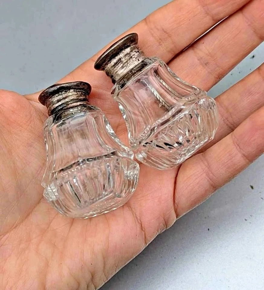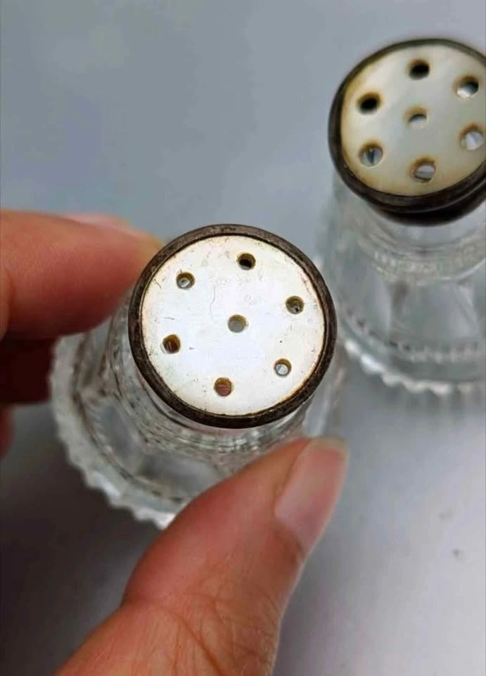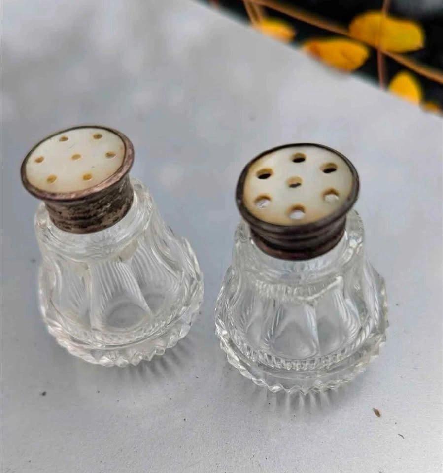 I have 2 sets available. $10/set. Charming antique cut crystal salt and pepper shakers. The tops are made from genuine mother of pearl with silver-plated collars, showing natural patina that adds vintage character. These petite shakers were likely part of an Edwardian or early-Art-Deco table set, perfect for collectors of fine tableware or as an elegant touch to vintage dining décor. Height: approx. 2.5". Era: Circa 1900–1930. Condition: Very good antique condition; mild tarnish and wear consistent with age, no cracks or chips.