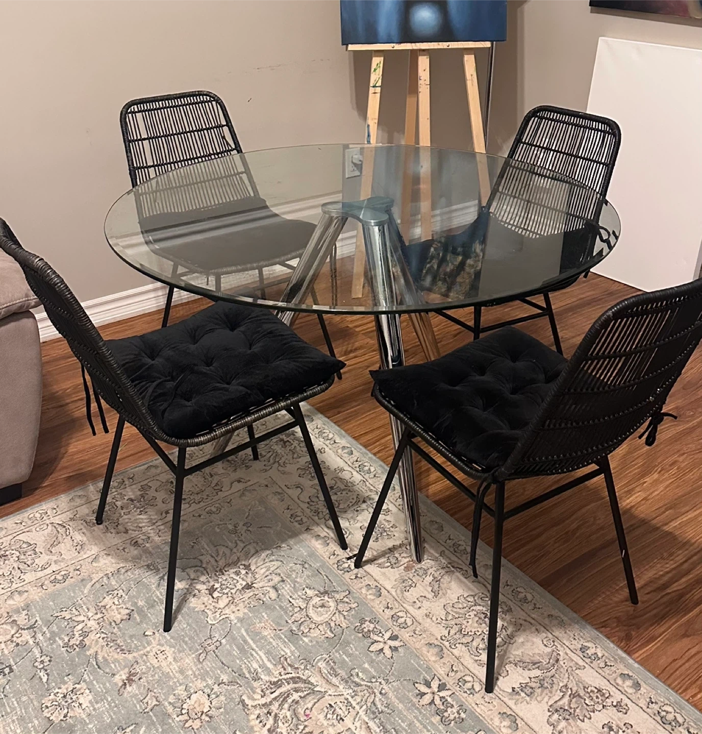 This set includes a round glass top dining table with a chrome base and four black woven chairs with plush black cushions. It's a stylish addition to any dining space. The chairs are comfortable for seating.