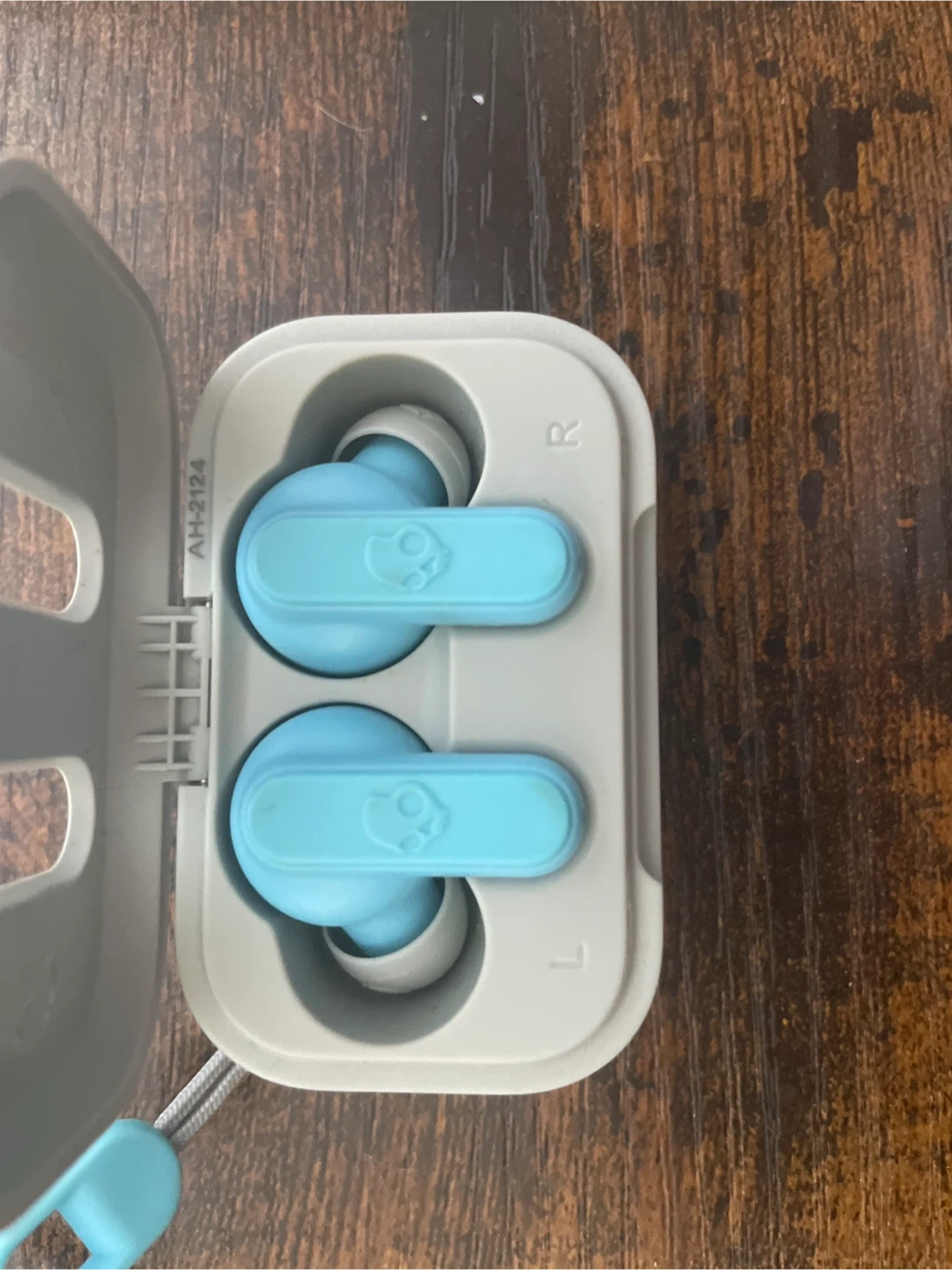 Here's a pair of blue Skullcandy Dime true wireless earbuds. They come with their charging case. Great for listening to music or podcasts on the go!