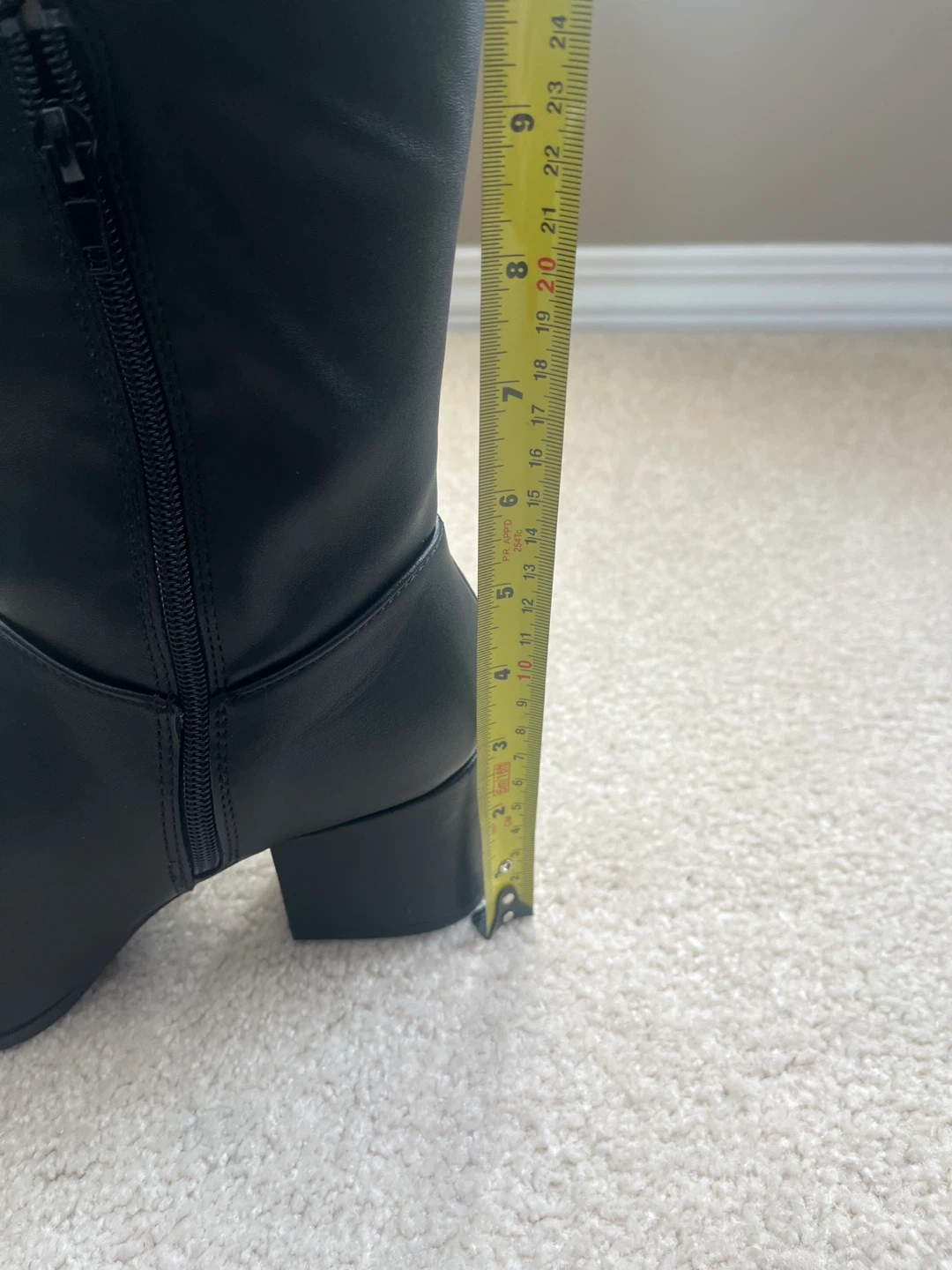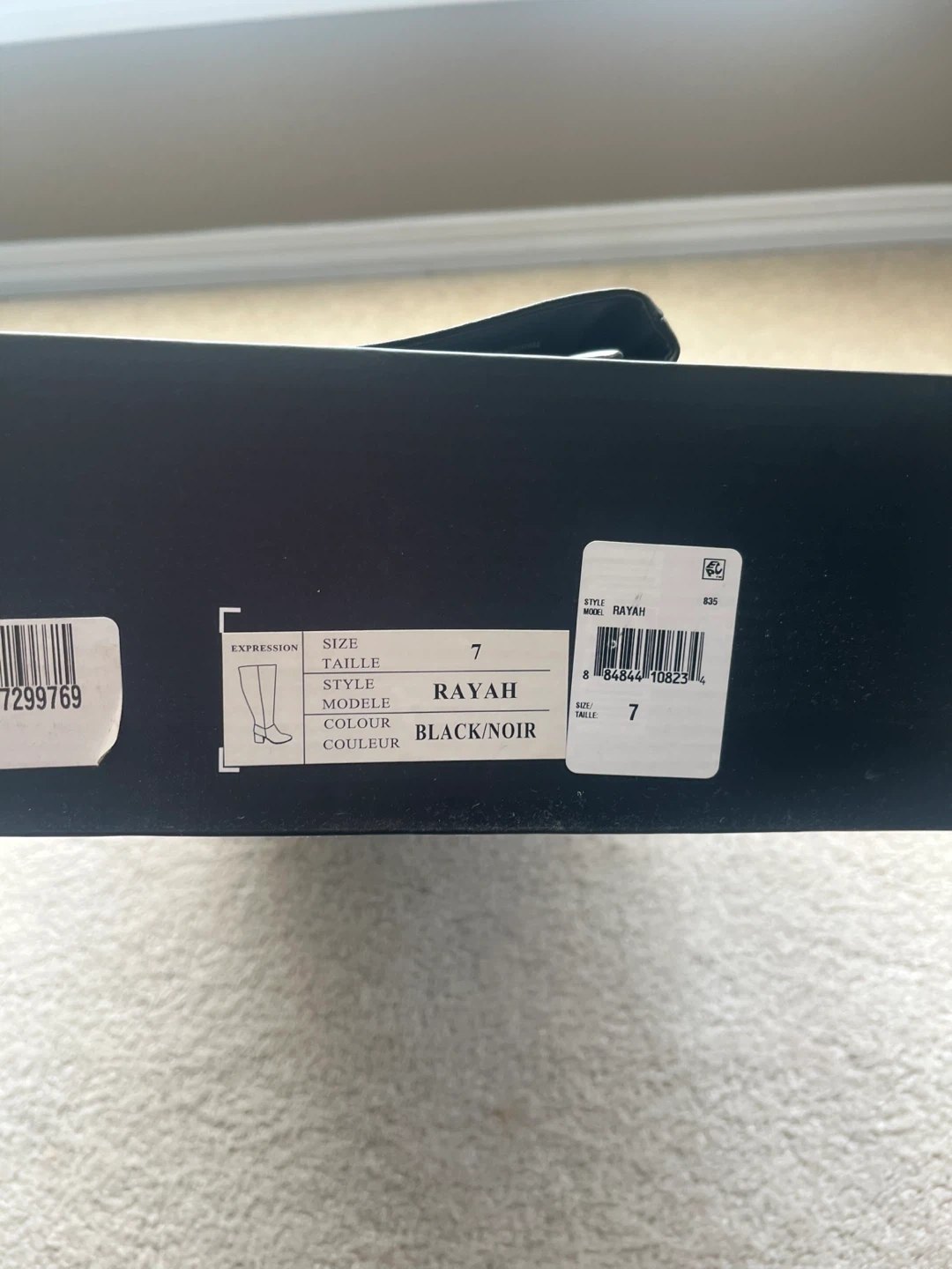 Black knee-high boots with a zipper closure. Model name is Rayah. Includes original box. These boots are a size 7. They are knee-high in length. Brand new and never worn.