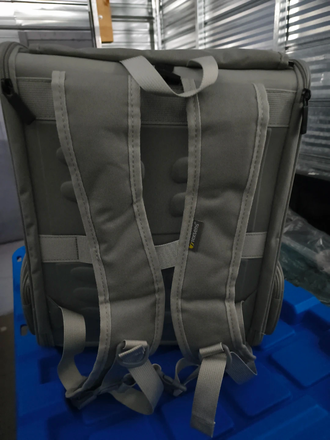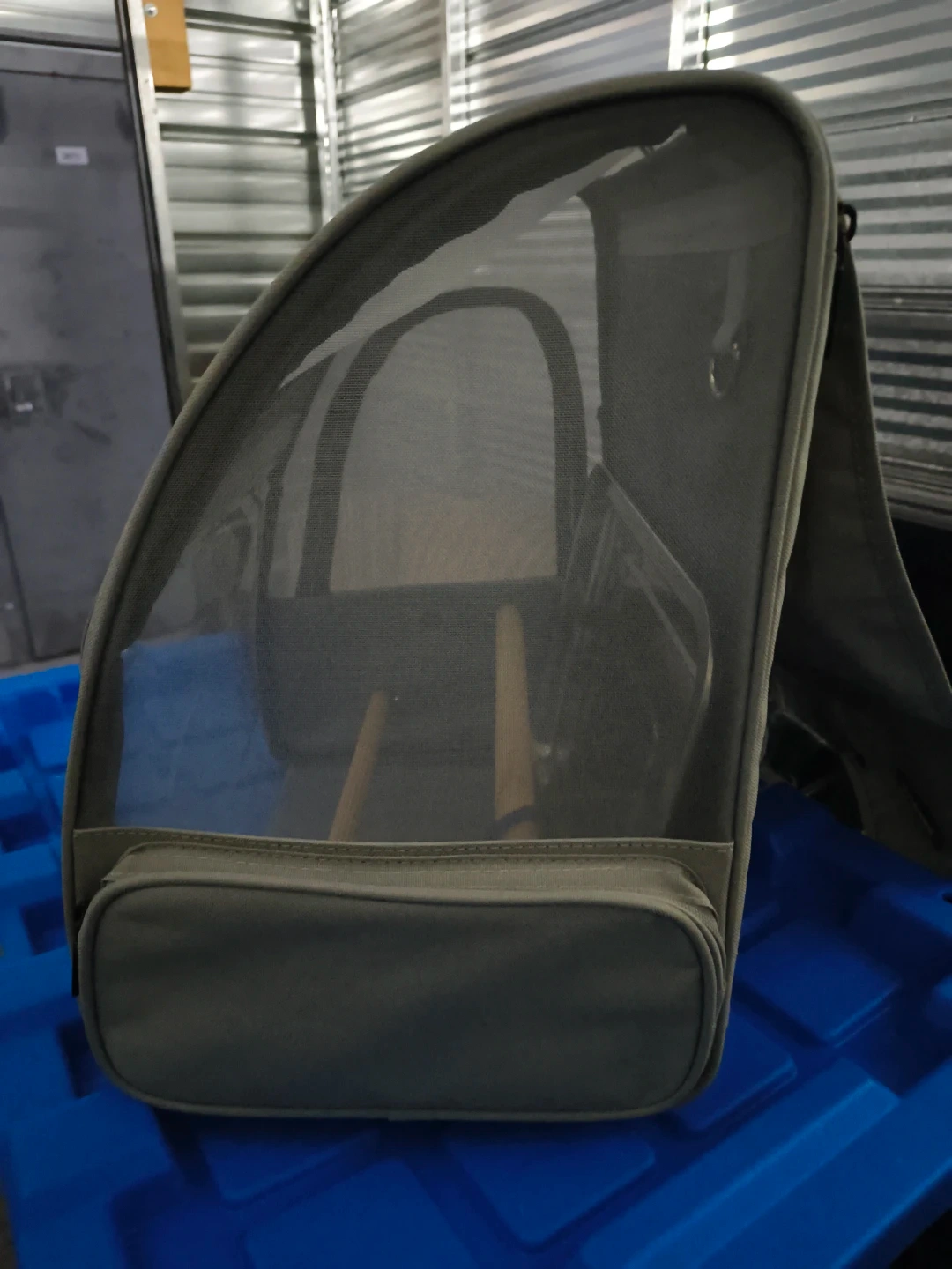 Grey pet carrier backpack for birds. It features multiple mesh windows for ventilation and clear front panels. Includes wooden perches inside for your bird's comfort. Great for travel!