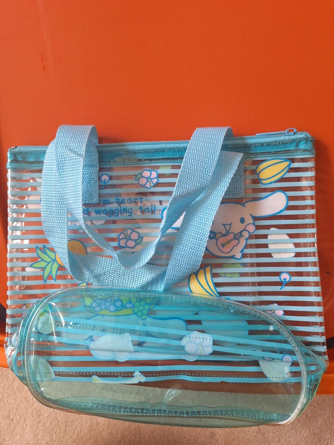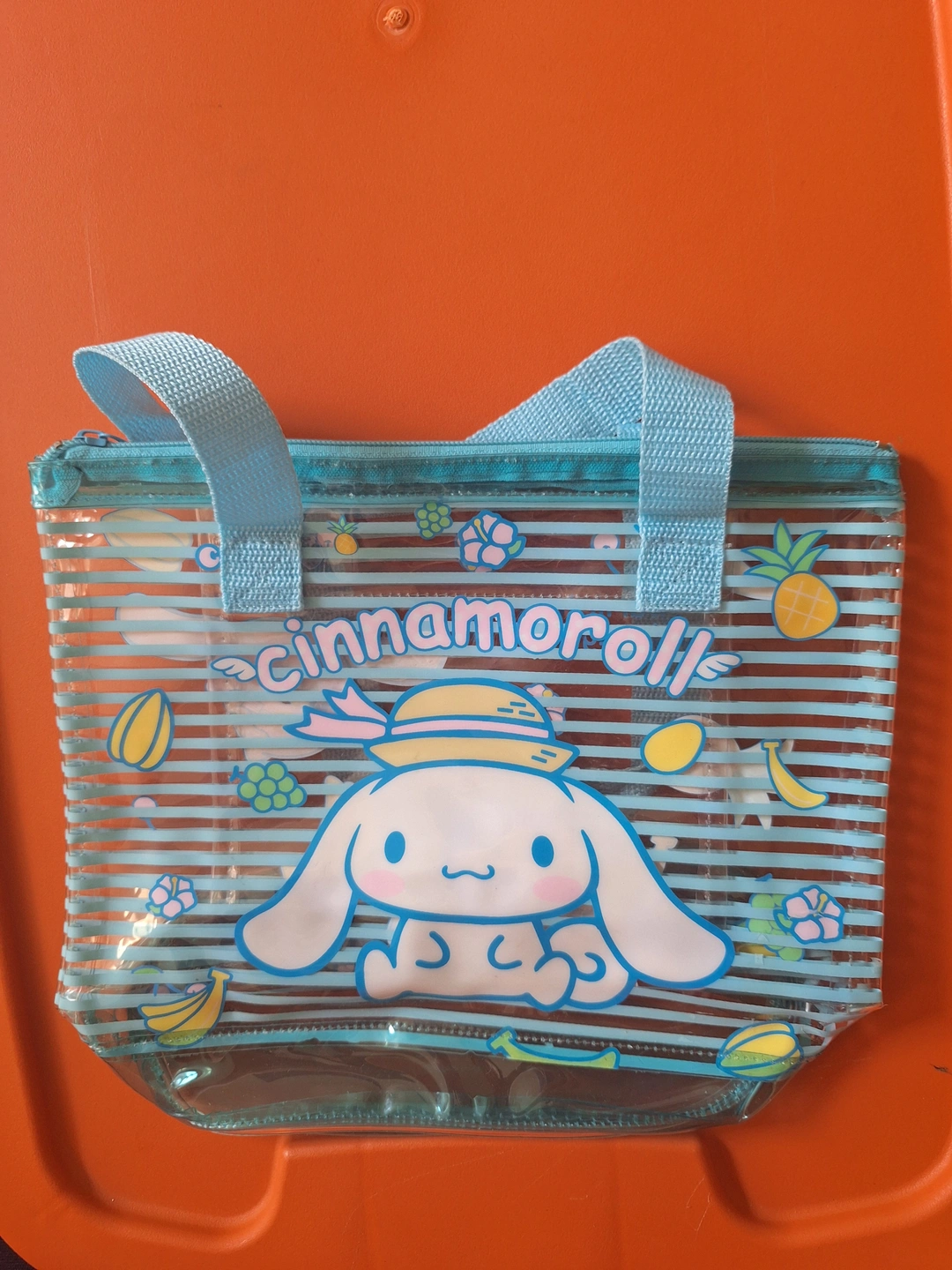 Super cute Cinnamoroll clear tote bag! Perfect for carrying your essentials with a touch of Sanrio charm. It features a fun, summery design with Cinnamoroll and some tropical fruits. Great for the beach or a casual day out