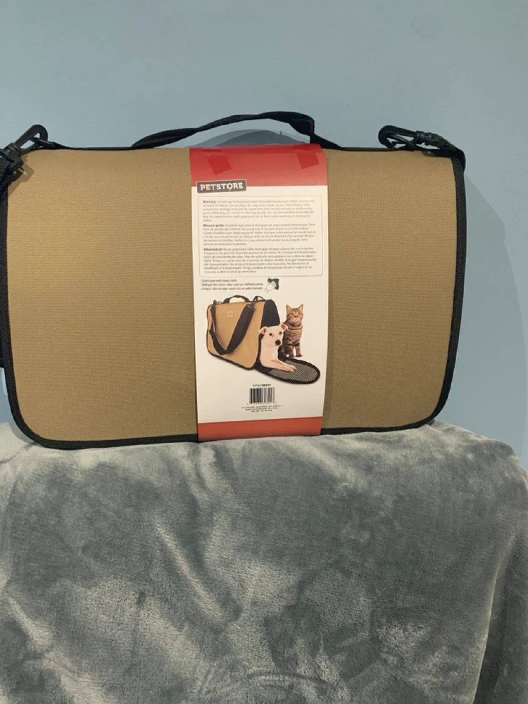 This is a Petstore brand pet carrier bag. It features a breathable mesh surface for easy breathing and supports pets up to 17.6 lbs. The shoulder strap length can be adjusted for comfort. Dimensions are 45 x 20 x 30 cm.