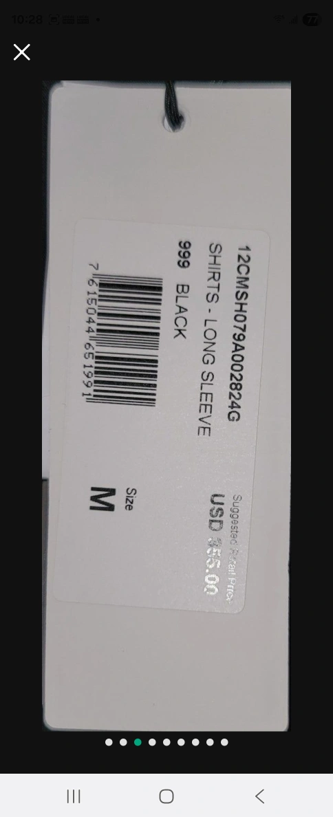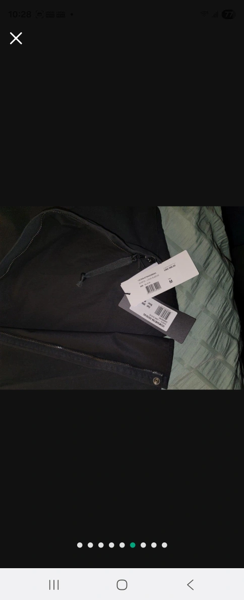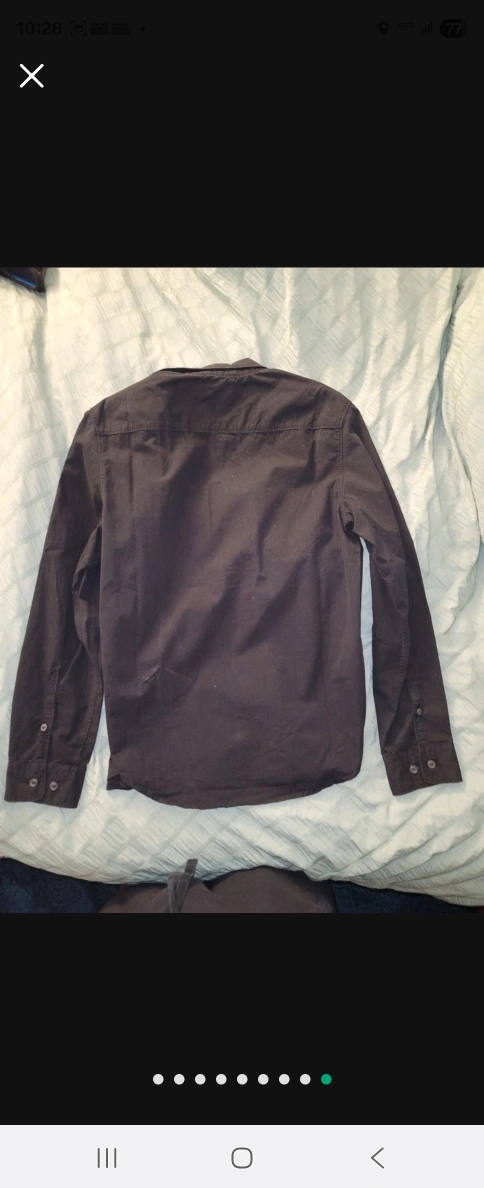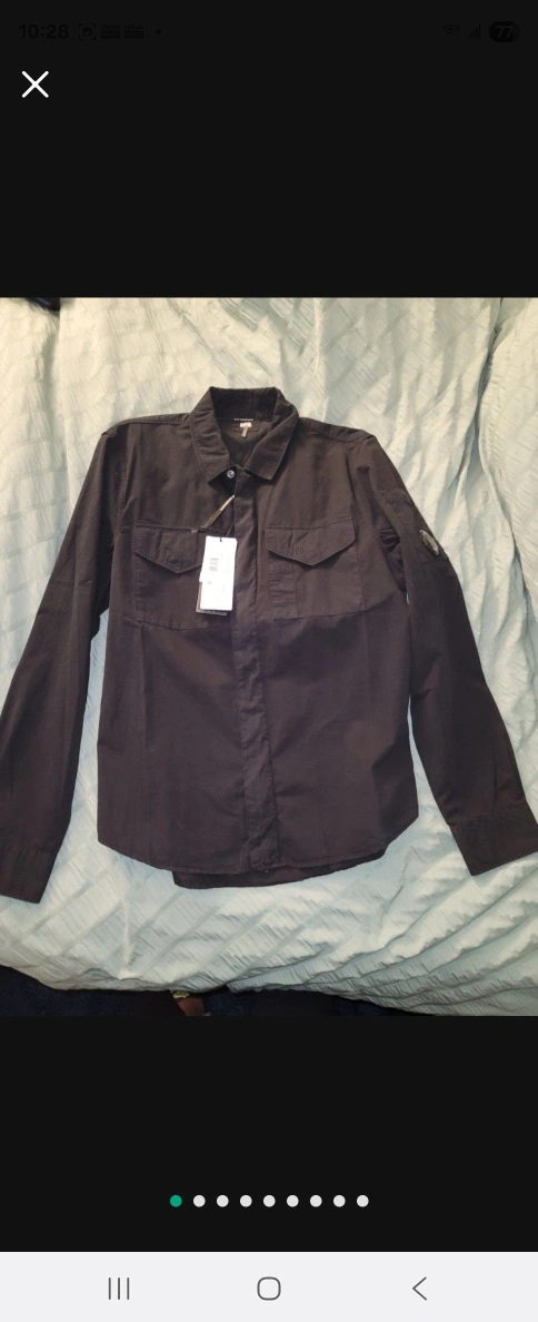 A black button up shirt. Features two chest pockets and a patch on the left sleeve. Brand tag still attached. It is perfect for a relaxing day out.