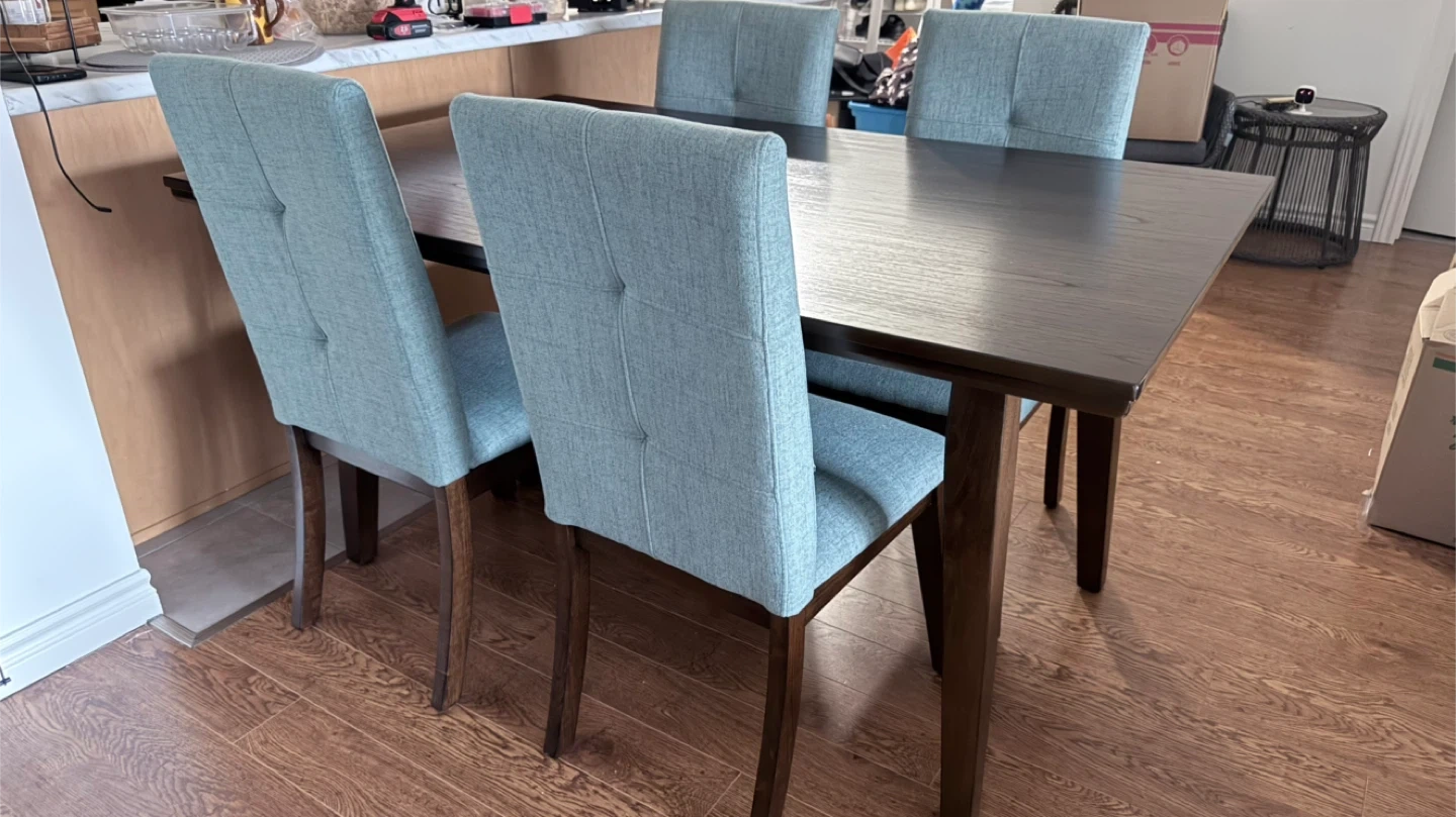 Dark wood finish dining table with four light blue fabric upholstered chairs. Chairs have button-tufted backs and wooden legs. It's a great set for smaller dining spaces.