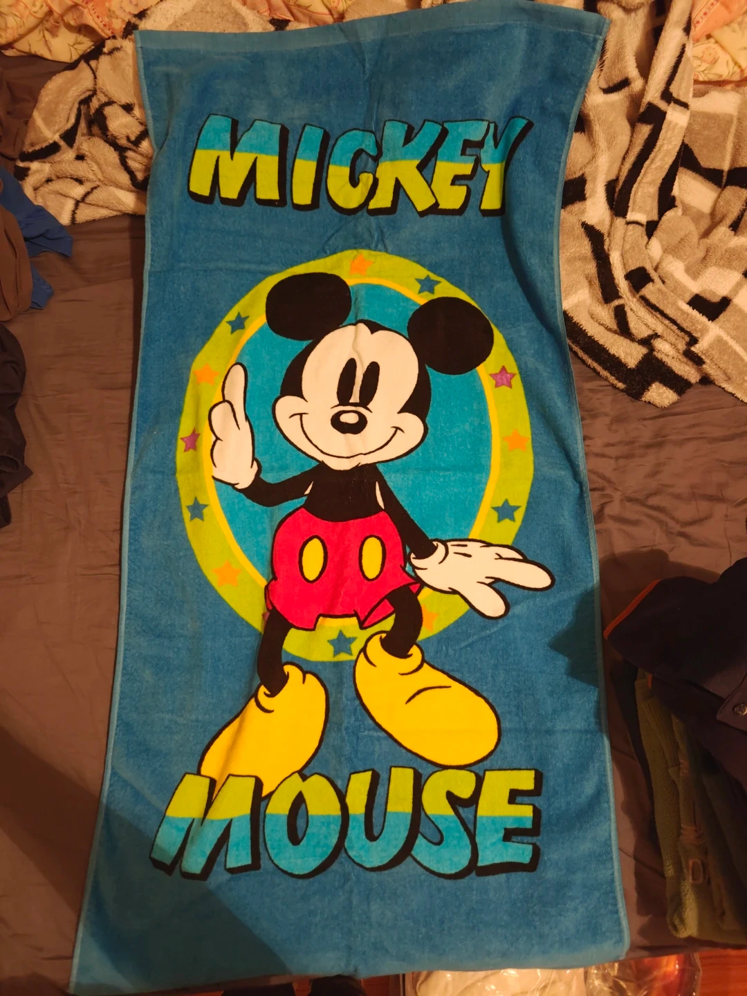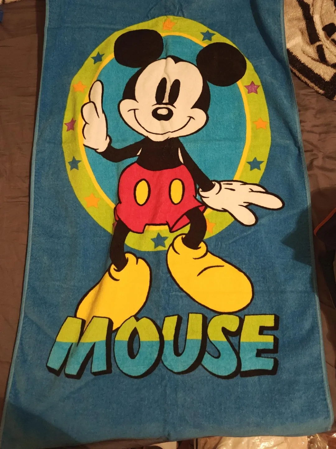 Blue Mickey Mouse beach towel with classic character graphic. Measures approximately 70" x 35". Made of soft, absorbent cotton. Perfect for the beach, pool, or bath!