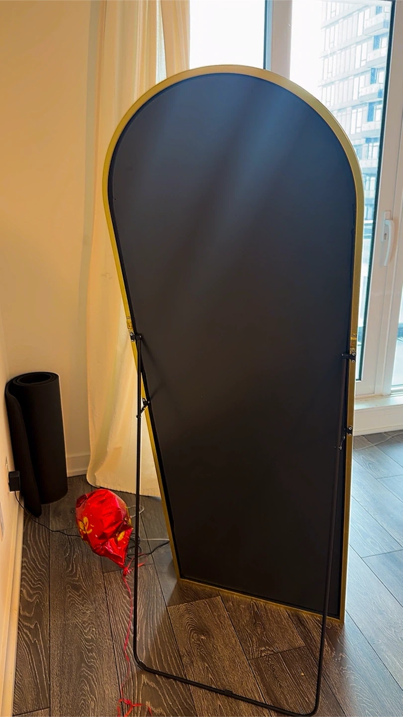 This full-length mirror features a modern arched design with a chic gold-toned frame. It's freestanding and perfect for checking your outfit or adding a decorative touch to your space. The mirror is tall and easily relocatable.