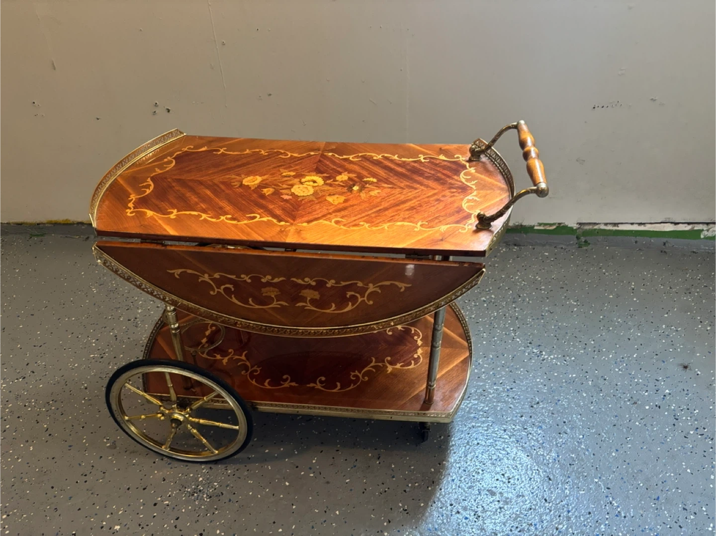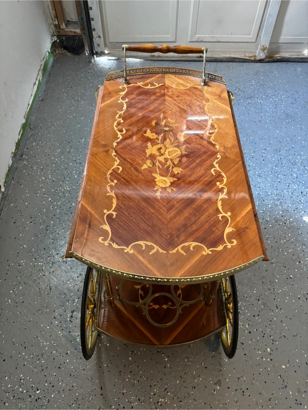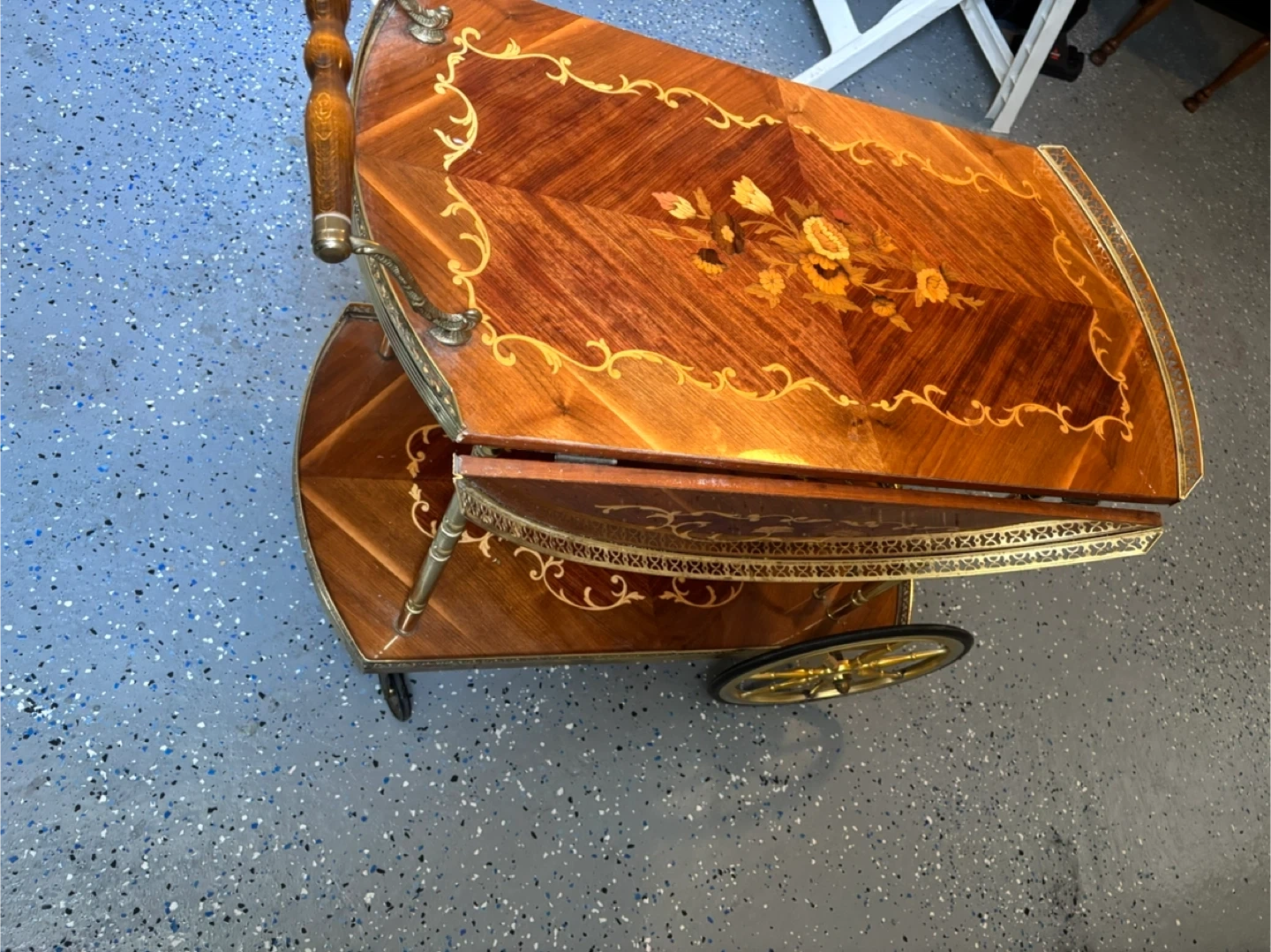 This is a beautiful two-tier bar cart with intricate wood inlay and decorative trim. It features two wheels and a handle for easy mobility. The top surface has a lovely floral inlay design. It's perfect for serving drinks or as a decorative accent piece.