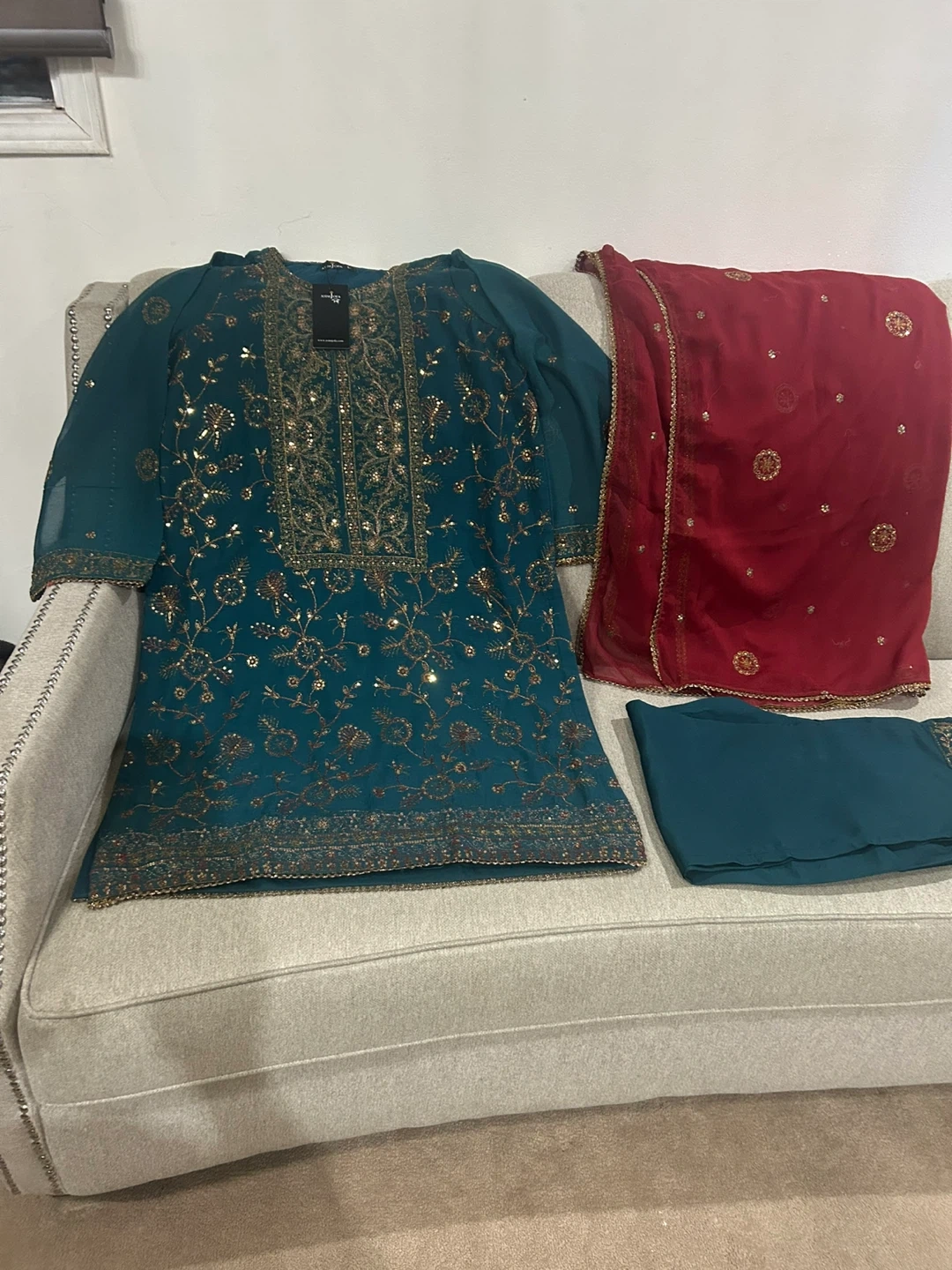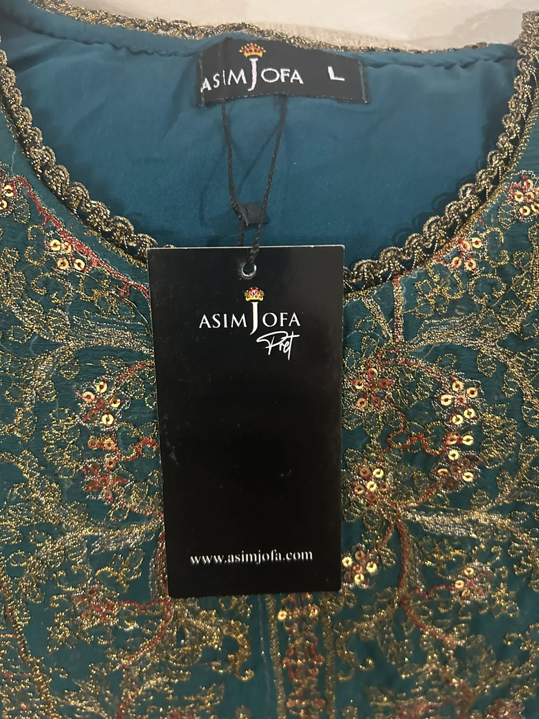 Beautiful teal 3-piece suit from Asim Jofa. It's heavily embroidered with gold thread and sequins, complete with a matching dupatta and trousers. This outfit is perfect for formal occasions and celebrations!
