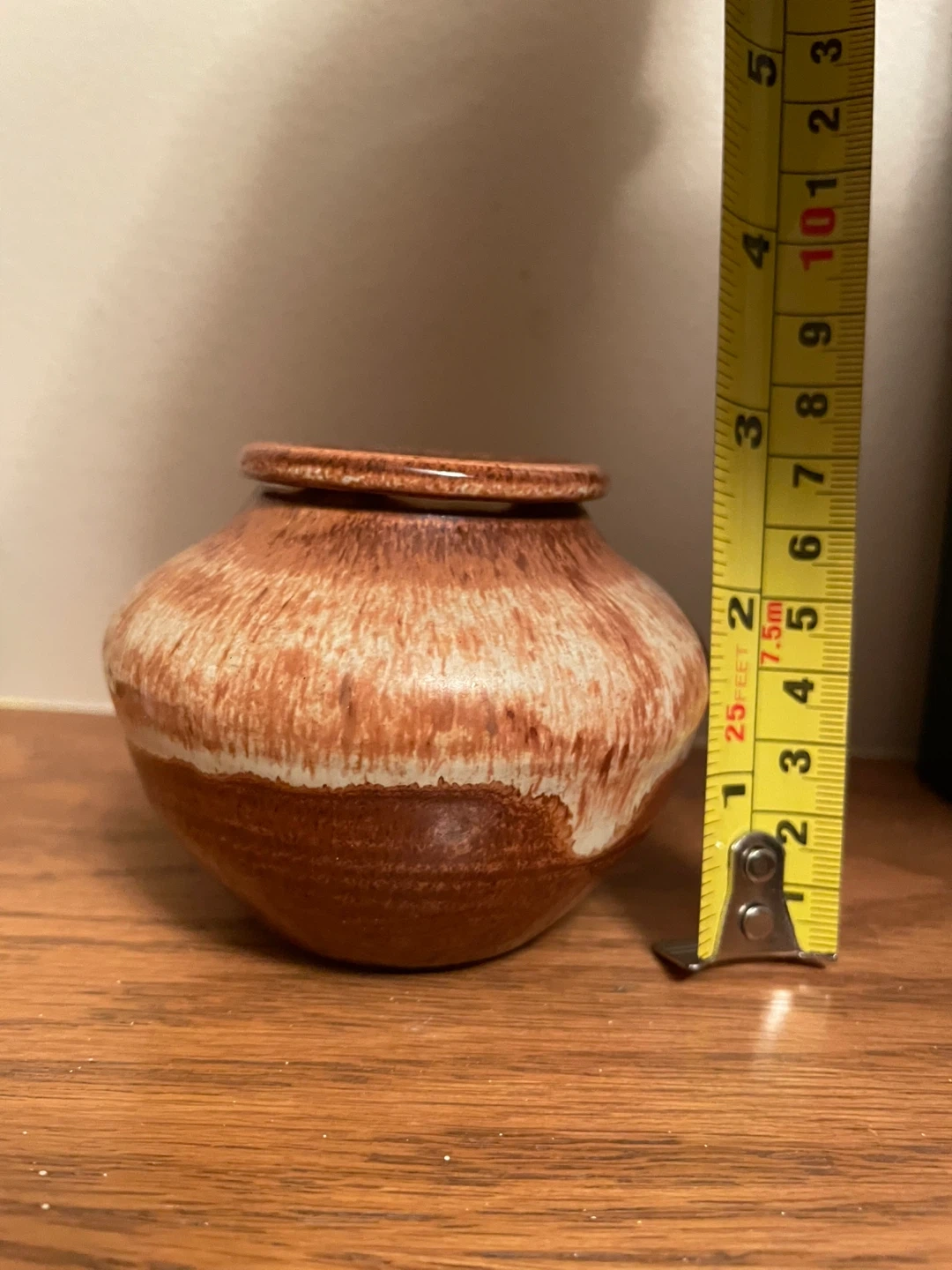 This is a small ceramic vase. It has a glazed finish in brown and white tones. Measures approximately 4 inches tall. It's a nice decorative piece for a shelf or table.