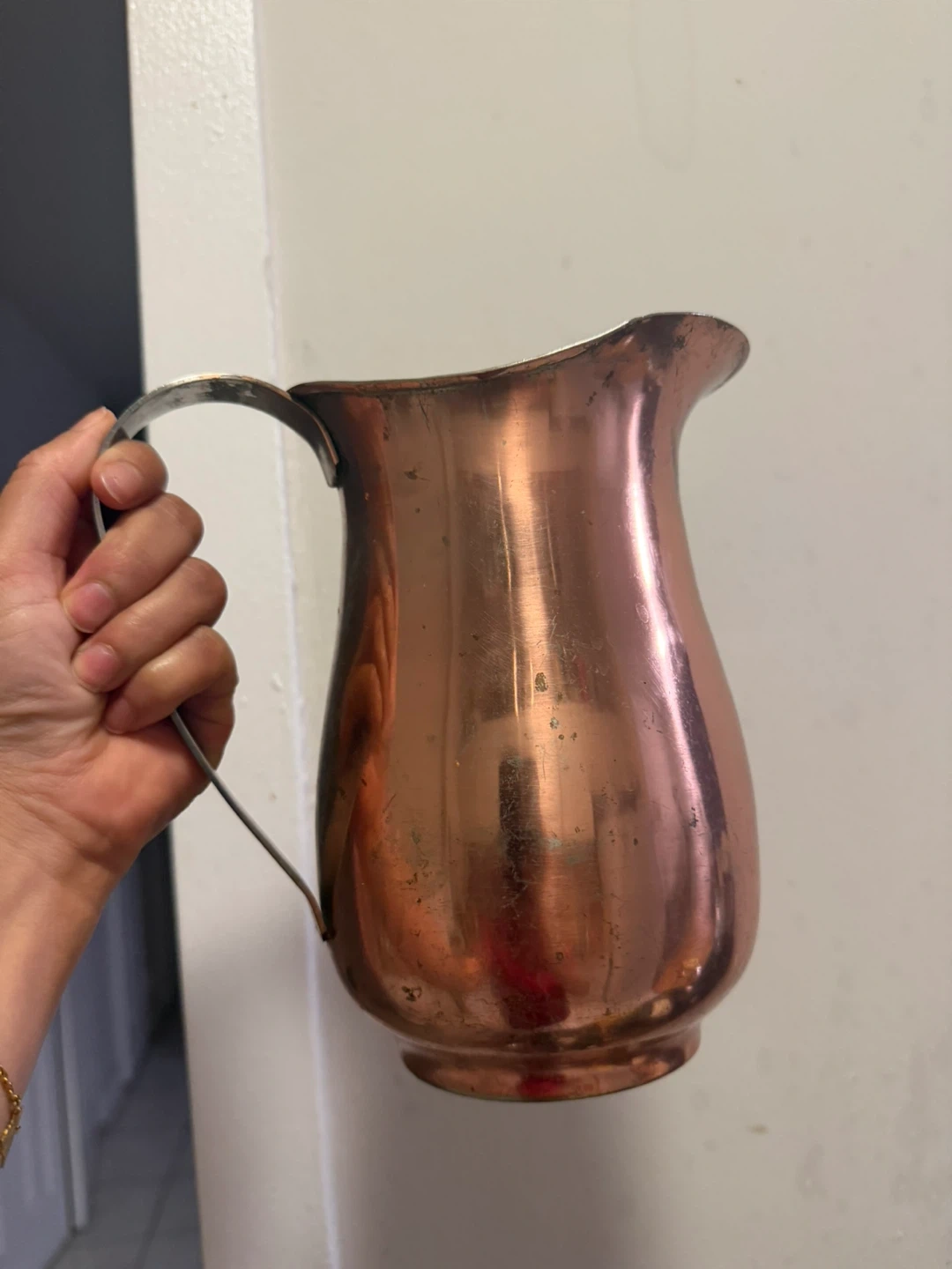 A classic copper pitcher with a sturdy metal handle. It's perfect for serving drinks or as a decorative piece. Shiny copper finish. inside is stainless steel