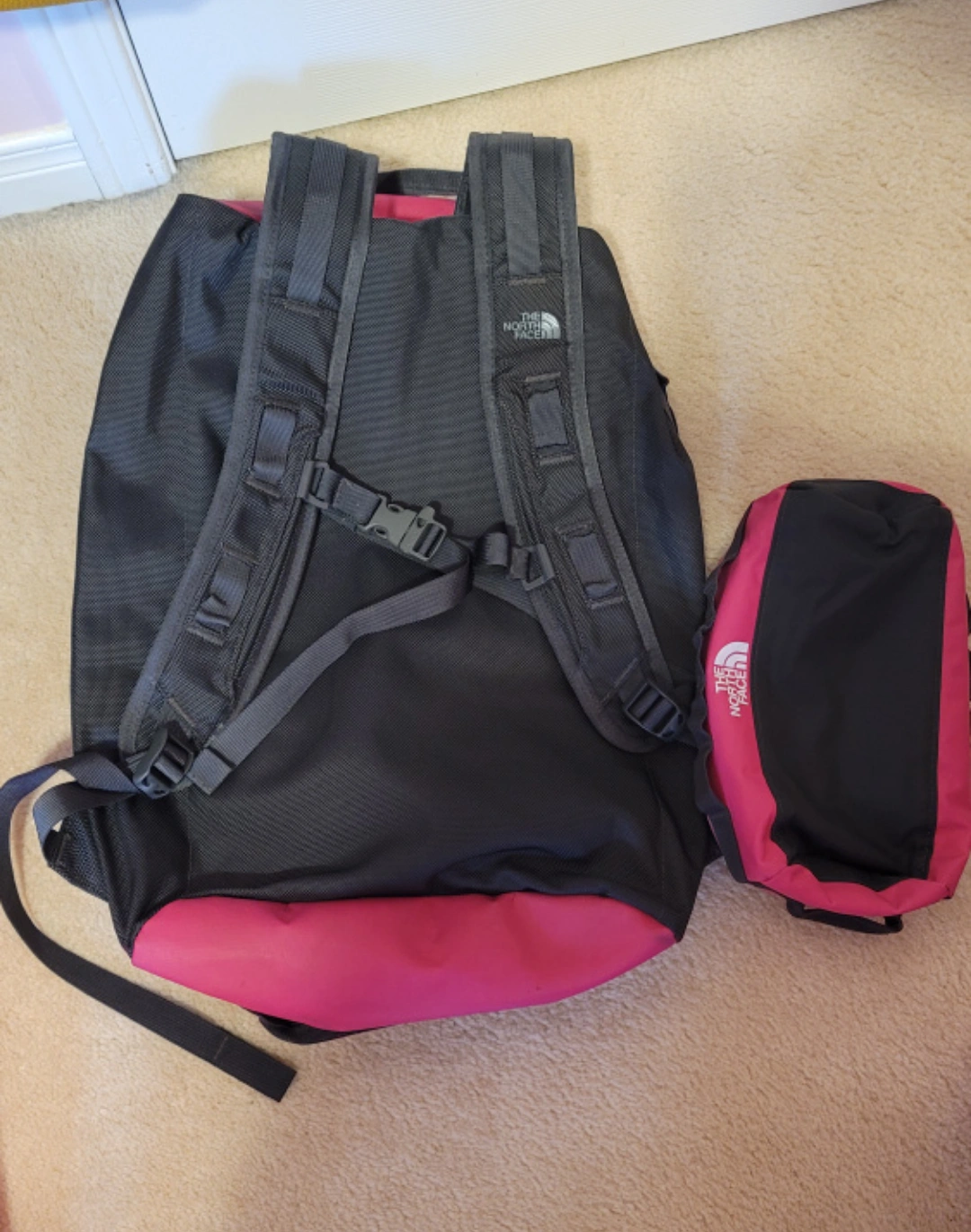 Pink The North Face duffle bag with a small base camp travel canister, super durable for taking your smaller personal item on the road.