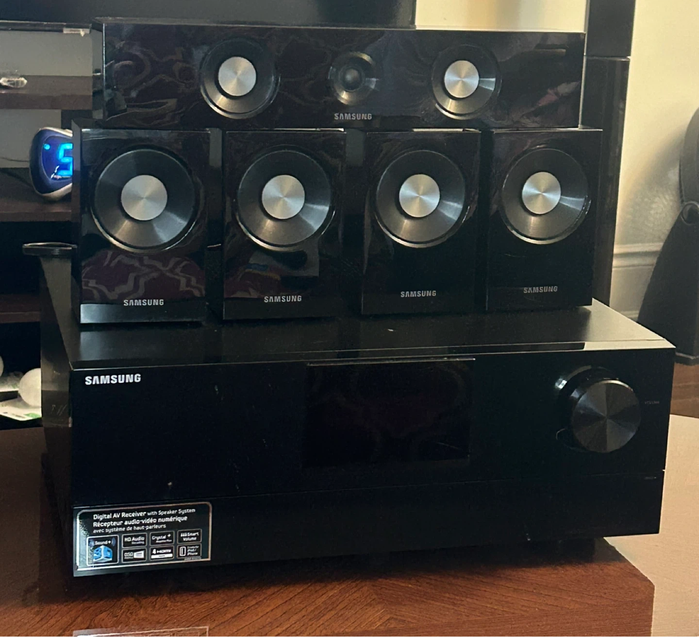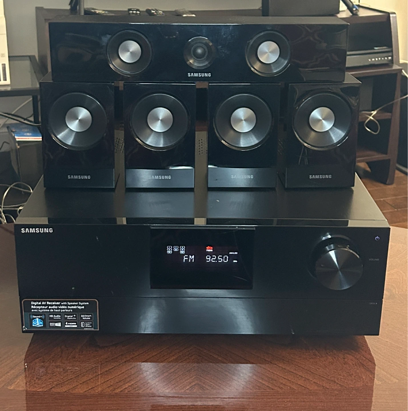 Selling a Samsung home theater system (Model Code: HW-D650S/ZC) with a full speaker setup. Includes the receiver, one centre speaker, four satellite speakers, and a subwoofer. The system is in great condition and fully functional. Remote control not included. Perfect for enhancing your home theatre experience.