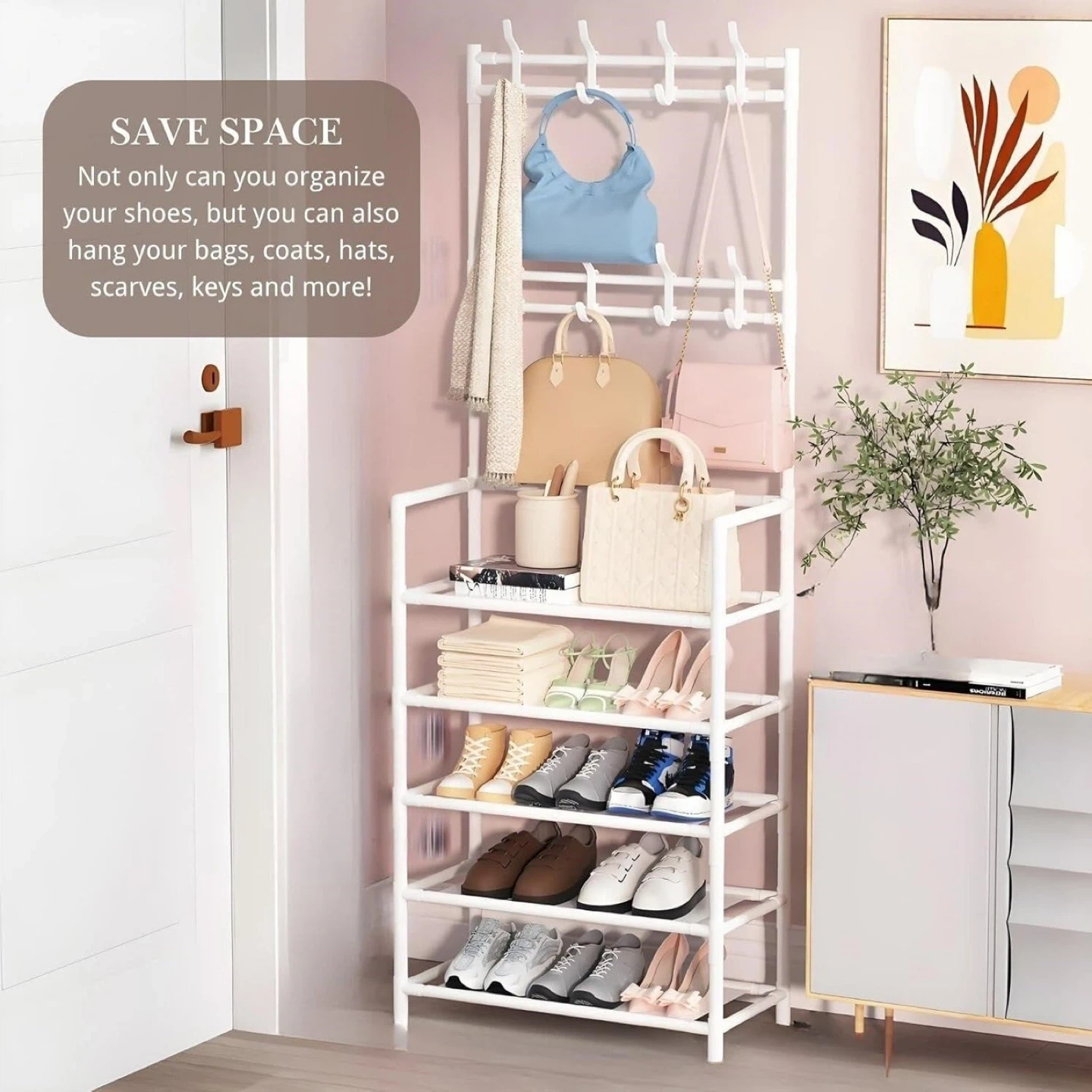 This metal shoe rack features five tiers for storage and an overhead coat rack with hooks. It's rustproof and designed for high load-bearing capacity. Assembly is easy, making it a neat and tidy solution for your entryway or closet.