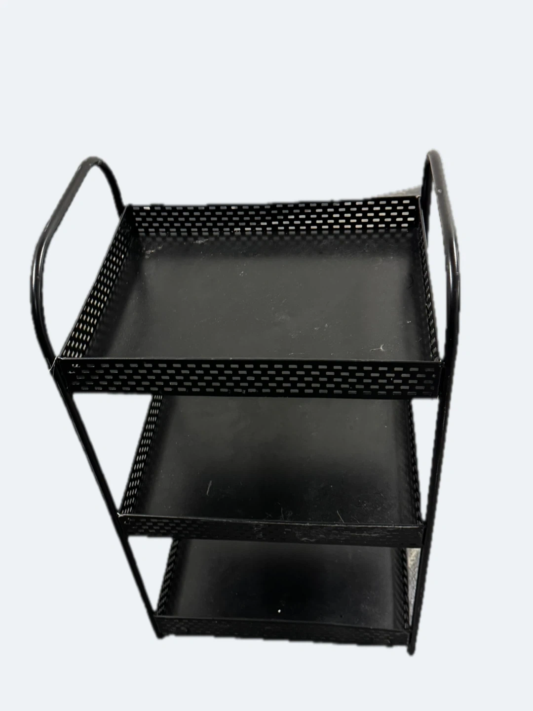 A black three-tier metal shelf organizer. The shelves are perforated for drainage. This organizer is useful for storing small items like toiletries or craft supplies.