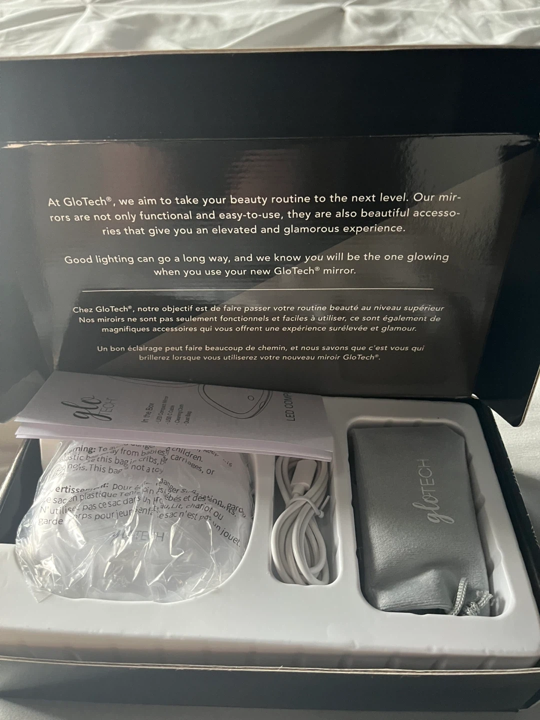 This Glo Tech LED Compact Mirror offers touch sensor dimming with 3 light color settings: warm, natural, and cool. It provides 1X and 10X magnification and features a rechargeable battery. Includes a USB C cable, cleaning cloth, and dust bag.