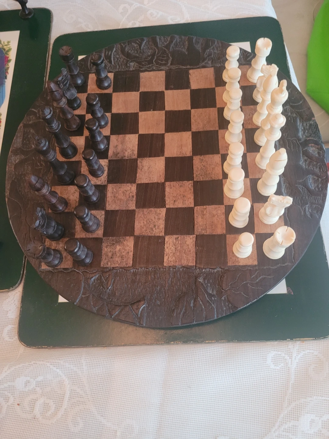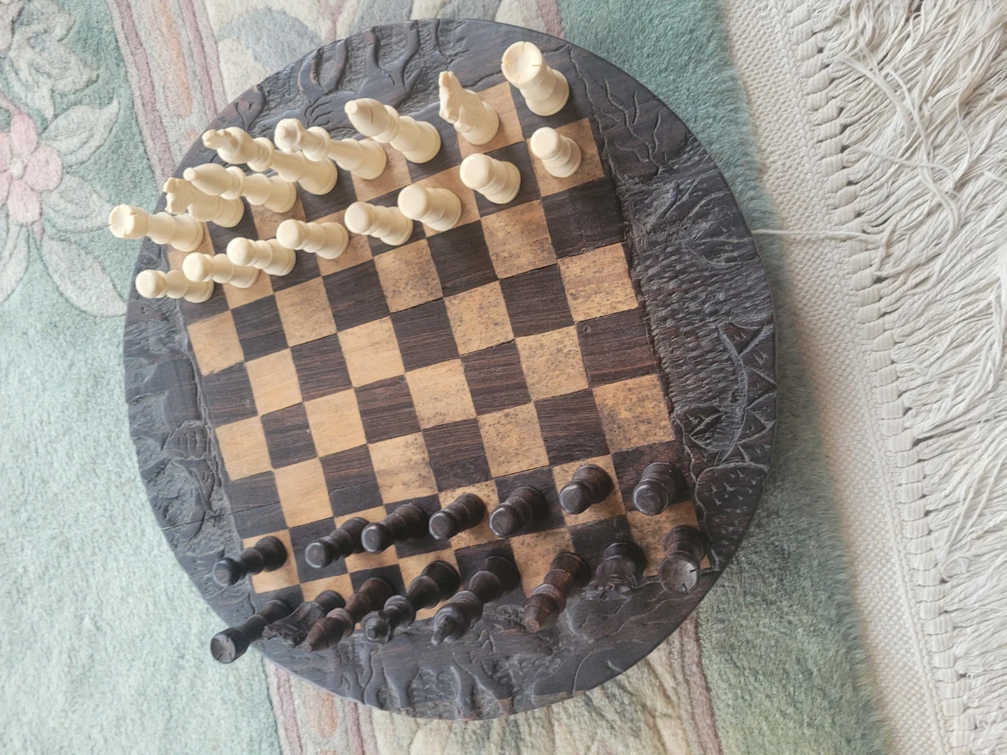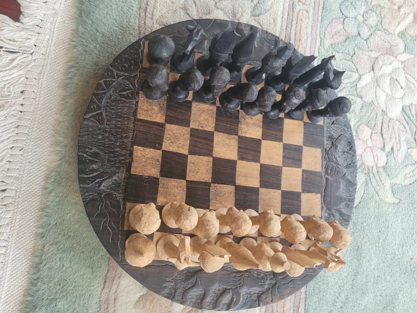 This is a beautifully carved wooden chess set with a round board. It includes a full set of light and dark pieces, each uniquely shaped. The board features intricate carved details around its edge.The white pieces are Nade of Ivory