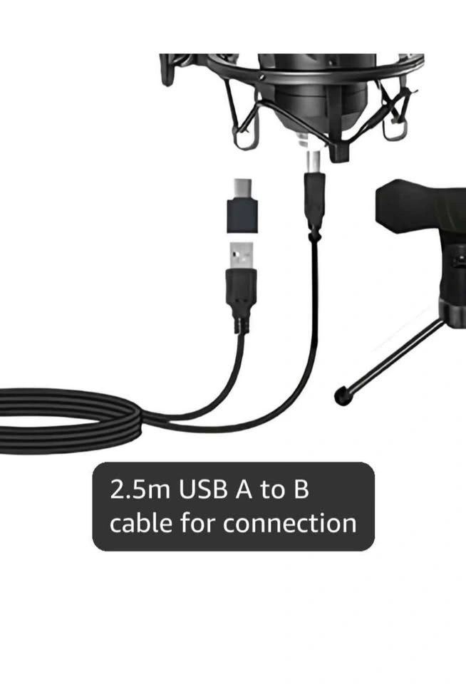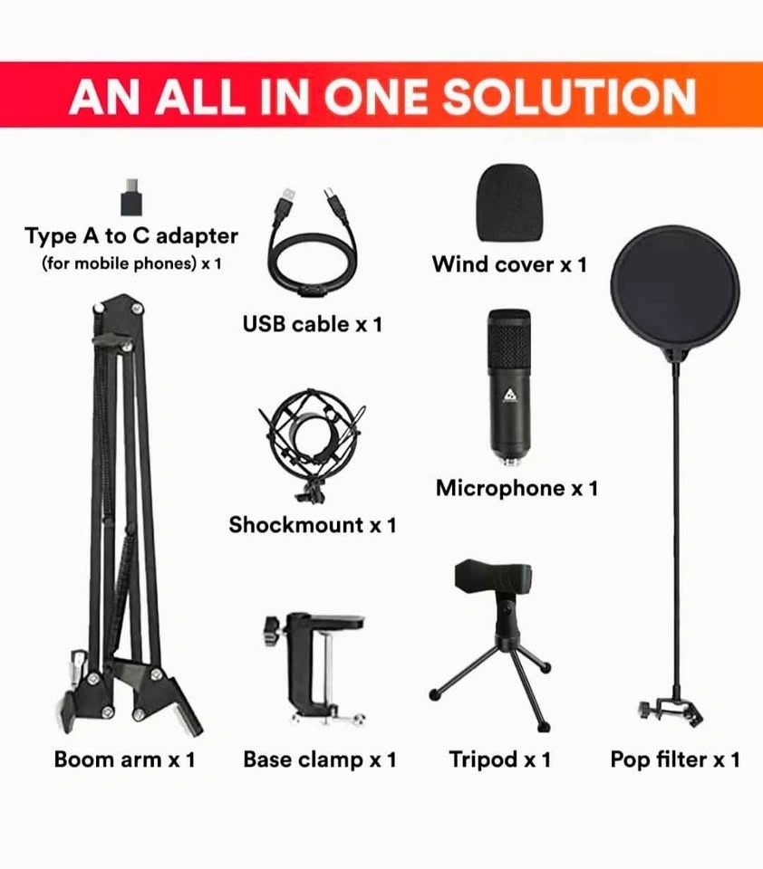 Includes: 1 condenser microphone, 1 metal shock mount, 1 adjustable suspension boom arm stand, 1 pop filter, 1 foam mic cover, 4 zip ties, 2.5m USB A to B cable, 1 Tripod, and 1 USB Type A To Type C Connector.