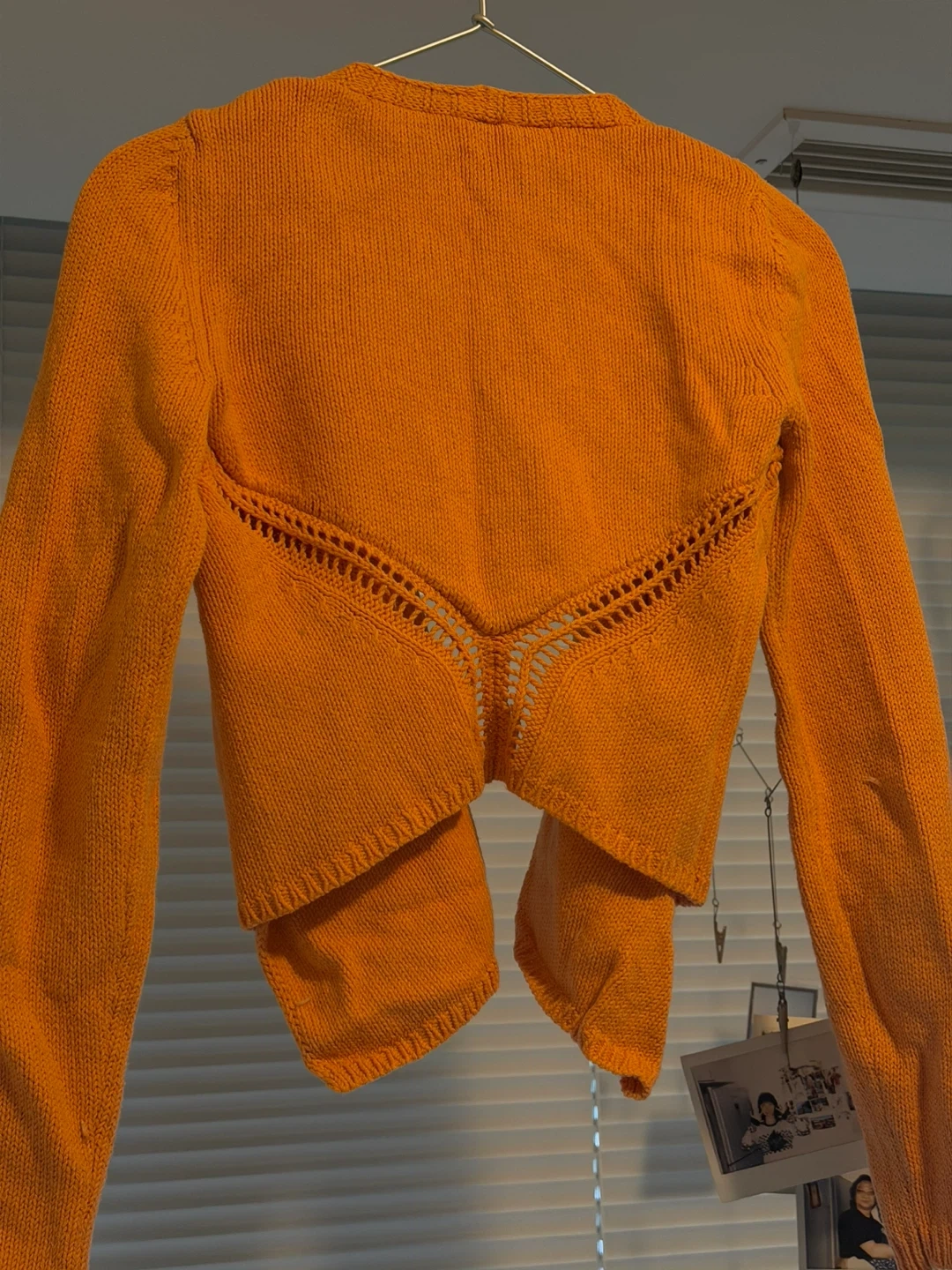 This orange knit cardigan features a cropped fit with long sleeves. It has a unique open knit detail at the back and an asymmetrical hemline. Made from a soft knit material, it's perfect for layering over tops or dresses. Only wore once