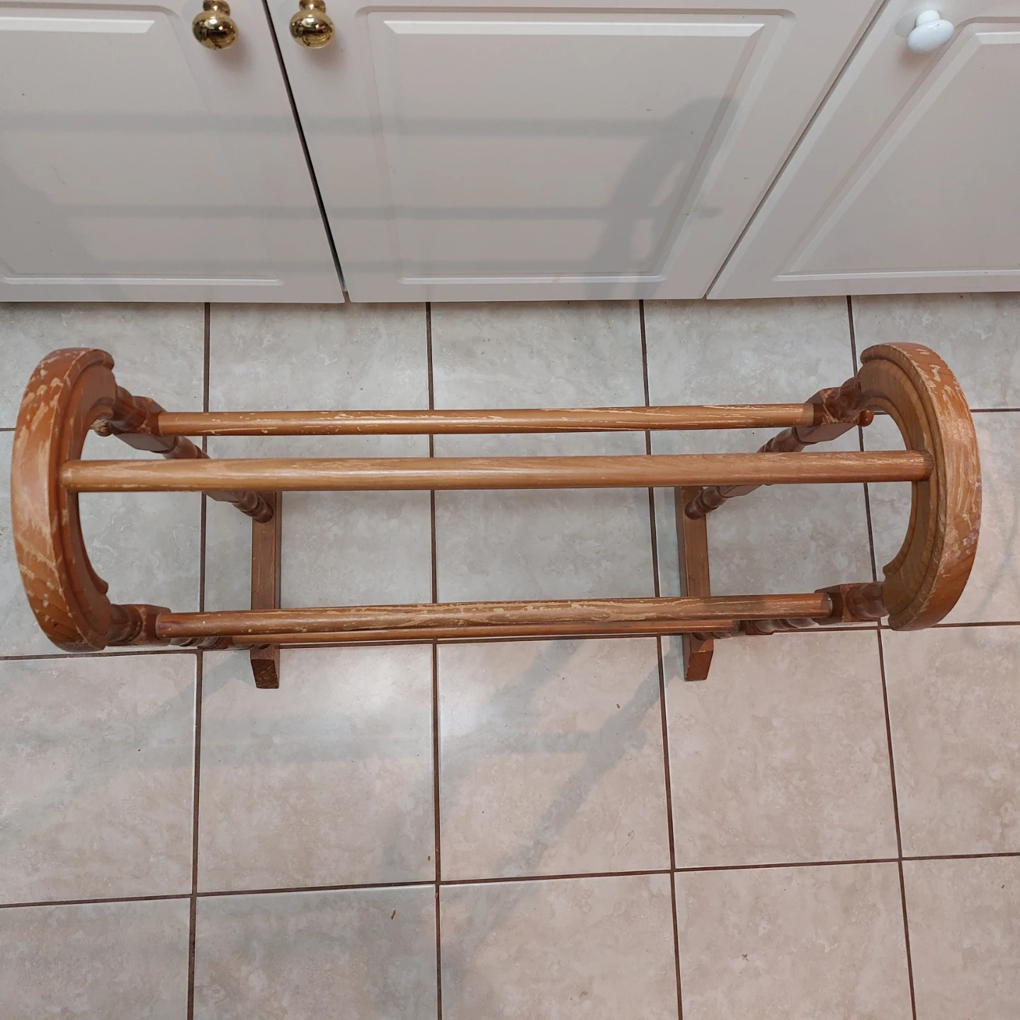 This wooden towel rack or blankets for storage . It's made of wood with a light brown stain. The rack's design is decorative and functional .The rack could use refinishing but is functional wirh character.