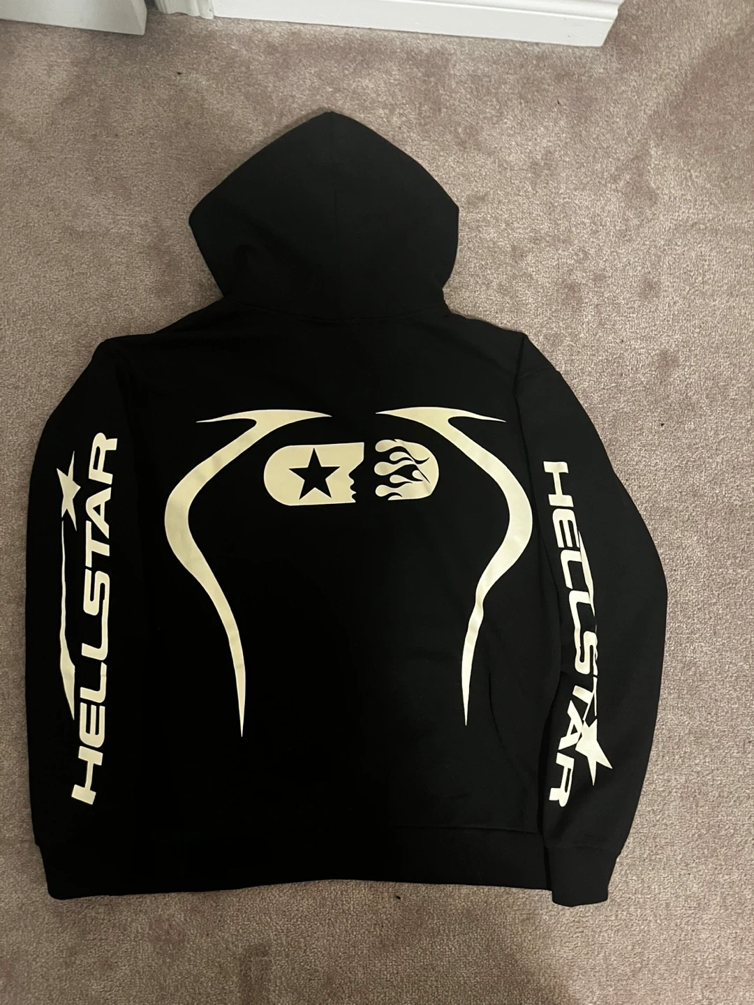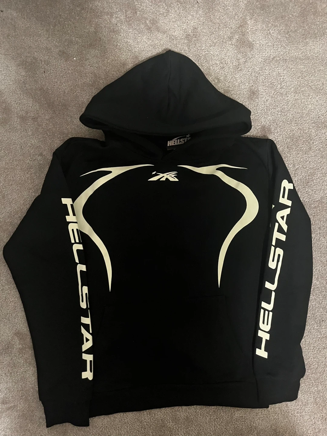 This is a black Hellstar hoodie with white graphic accents on the front and sleeves.