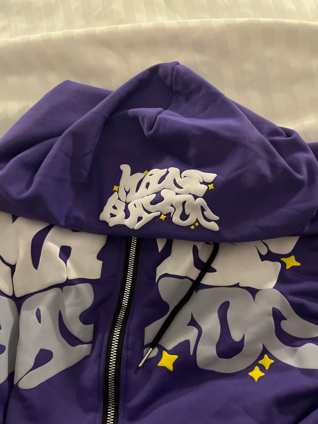 This purple zip-up hoodie features a cool graphic design on the front. It's a comfy and stylish piece for casual wear. Made from soft fabric, it's perfect for cooler days.
