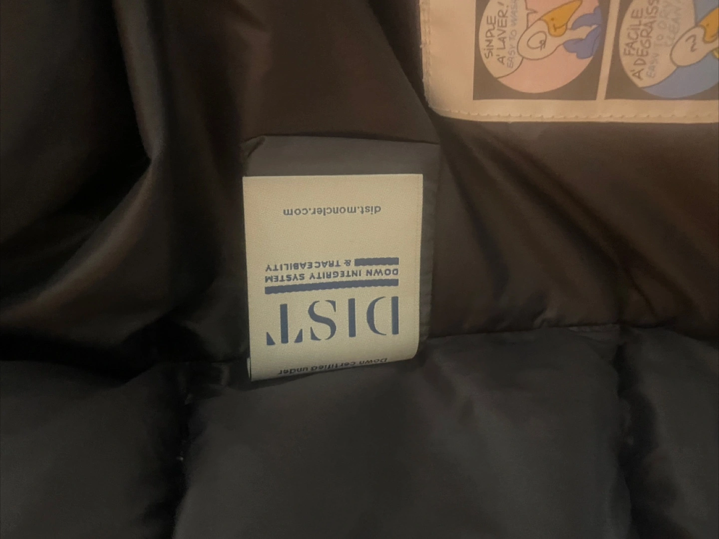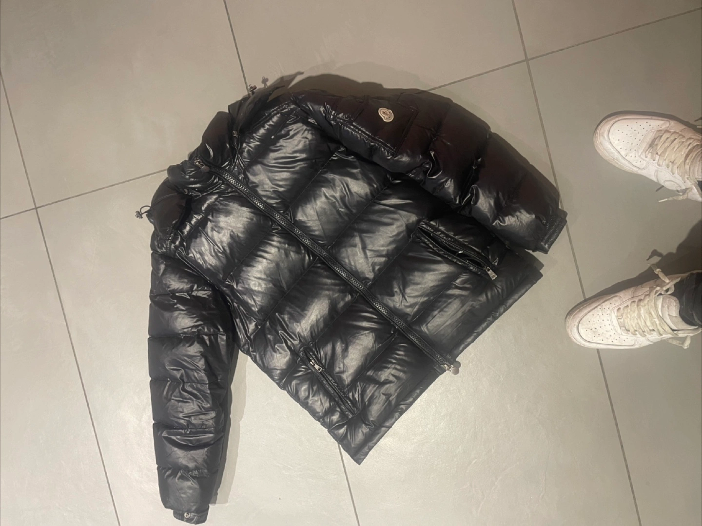 This is a Moncler black puffer jacket. It's a shiny, quilted down-filled coat with a hood. Includes original tags and down integrity system certification.