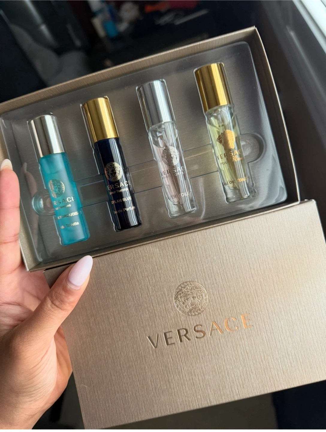 Selling a Versace miniature perfume set, including four different scents: Versace Turquoise, Versace Dylan Blue, Versace Bright Crystal, and Versace Pour Femme. The box is included!