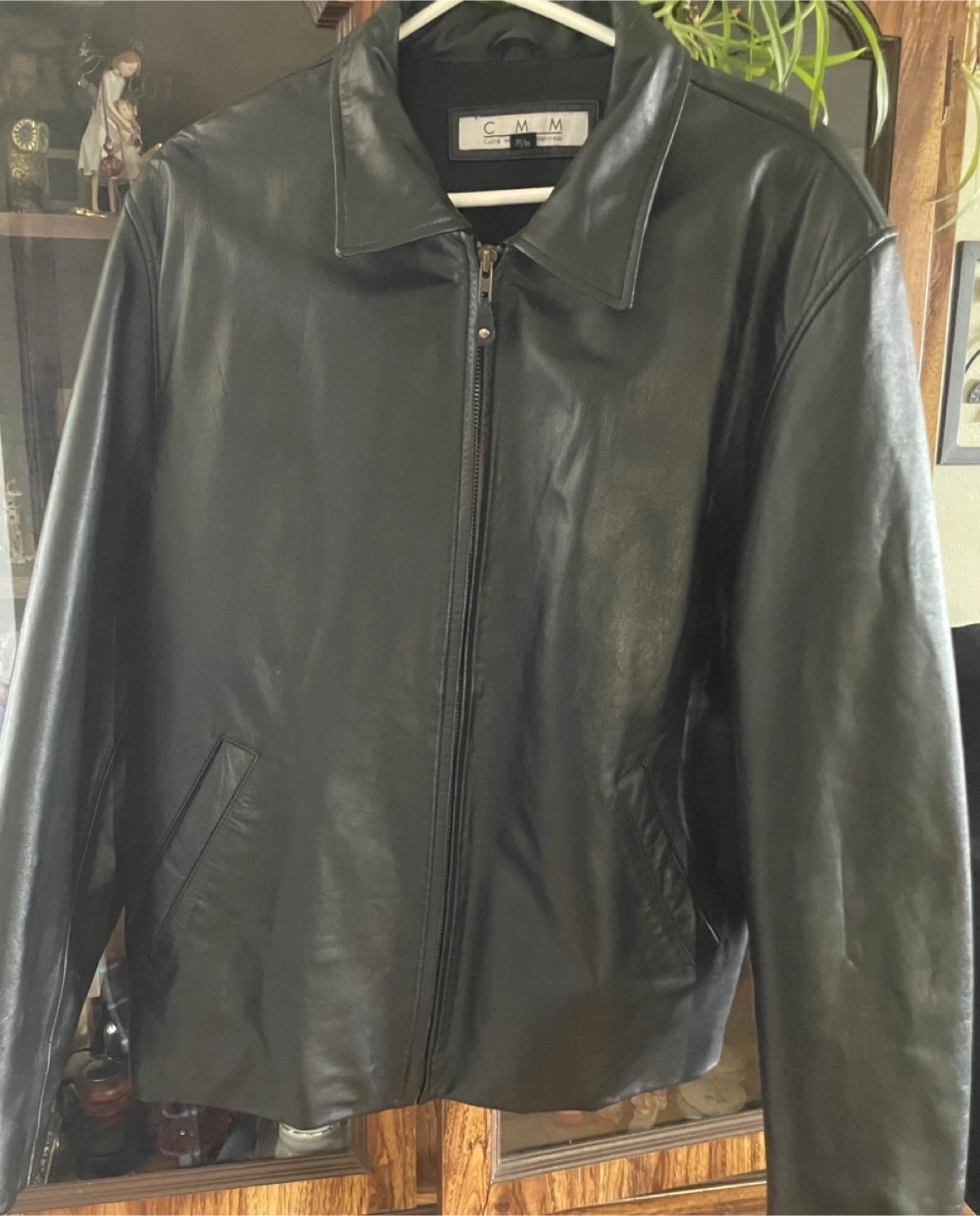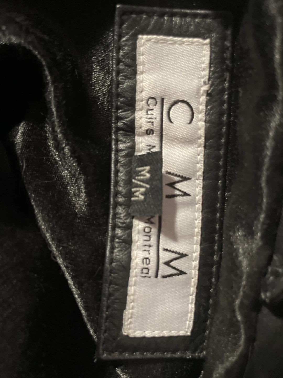 A black genuine leather jacket from CMM. The outer shell is 100% leather, with a lining of 50% cotton and 50% acetate. It's a stylish choice for cooler weather.